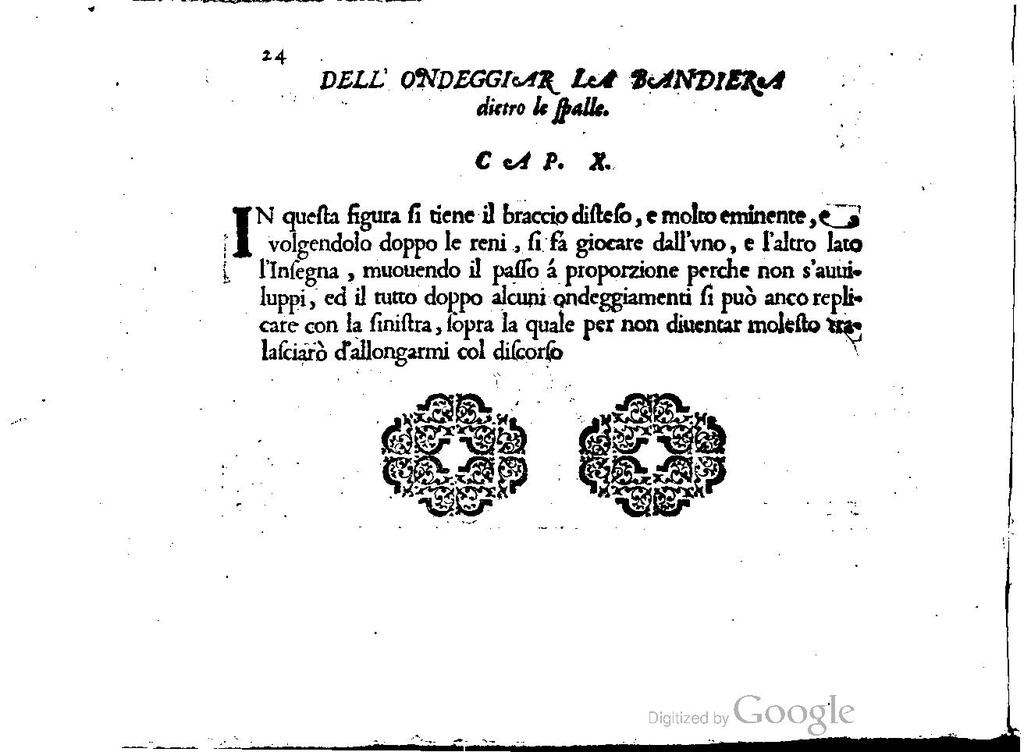 IN questa figura si tiene il braccio disteso, e molto eminente, e volgendolo doppo le reni, si fà giocare dallʼuno e lʼaltro lato lʼInsegna, muovendo il passo a proporzione perché non sʼavviluppi, ed il tutto doppo alcuni ondeggiamenti si può anco replicare con la sinistra, sopra la quale per non diventare molesti tralascierò dʼallongarmi nel discorso.