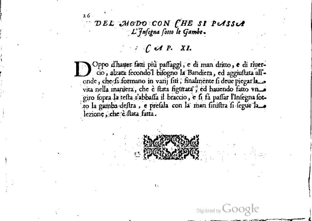 DOppo dʼaver fatti più passaggi, e di man dritto e di rivercio, alzata secondoʻl bisogno la Bandiera, ed aggiustata allʼonde, che si formano in vari siti, finalmente si deve piegare la vita nella maniera che è stata figurata, ed avendo fatto un giro sopra la testa sʼabbassa il braccio, e si fà passar lʼInsegna sotto la gamba destra, e presala con la man sinistra si segue la lezione che è stata fatta.