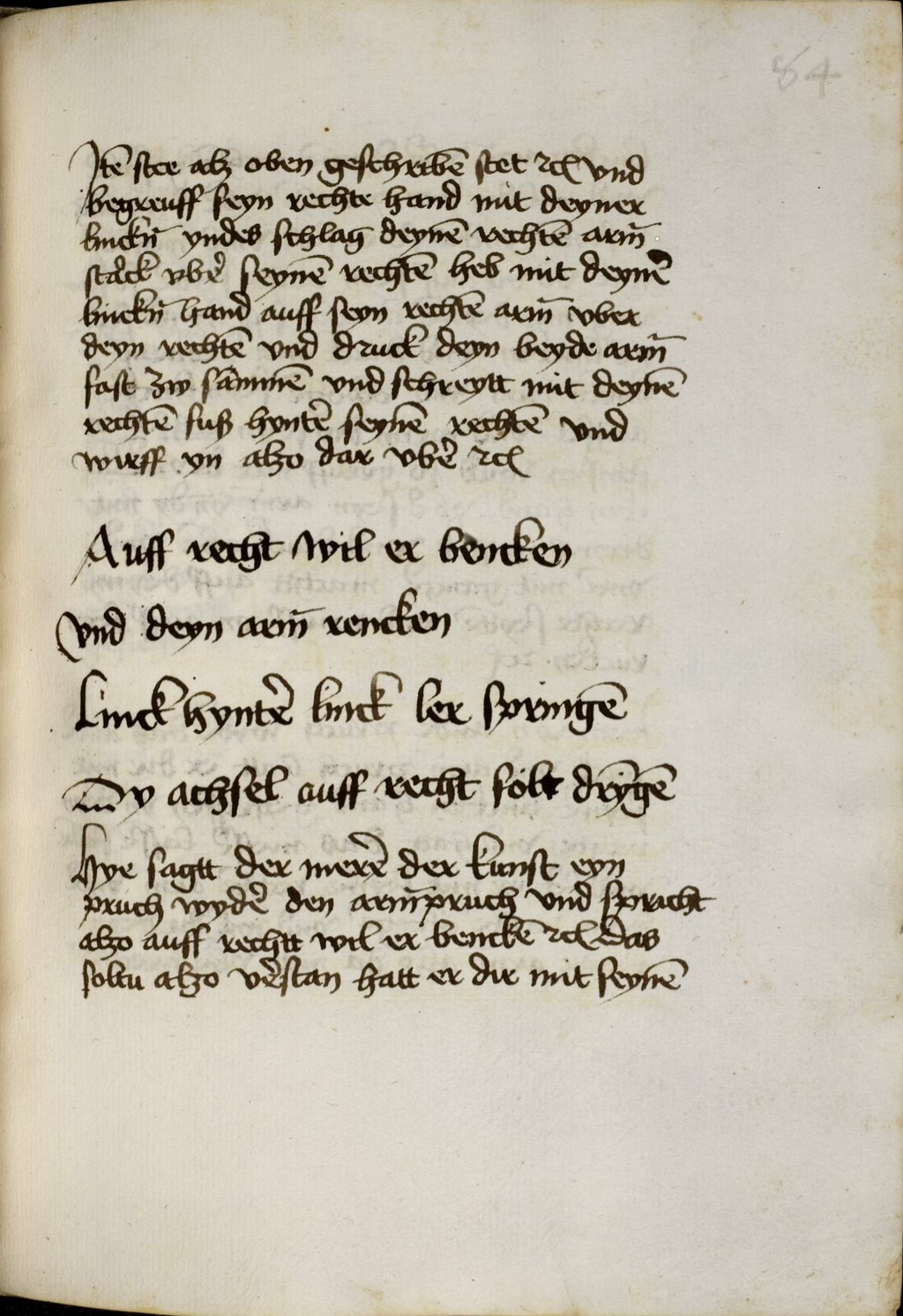 Item stee alz oben geschriben stet etc und begreuff seyn rechte hand mit deyner lincken yndeß schlag deynen rechten armen starck uber seynen rechten heb mit deyner lincken hand auff seyn rechten armen uber deyn rechten und druck deyn beyde armen fast zw sammen und schreytt mit deynem rechten fuß hynter seynen rechten und wirff yn alzo dar uber etc