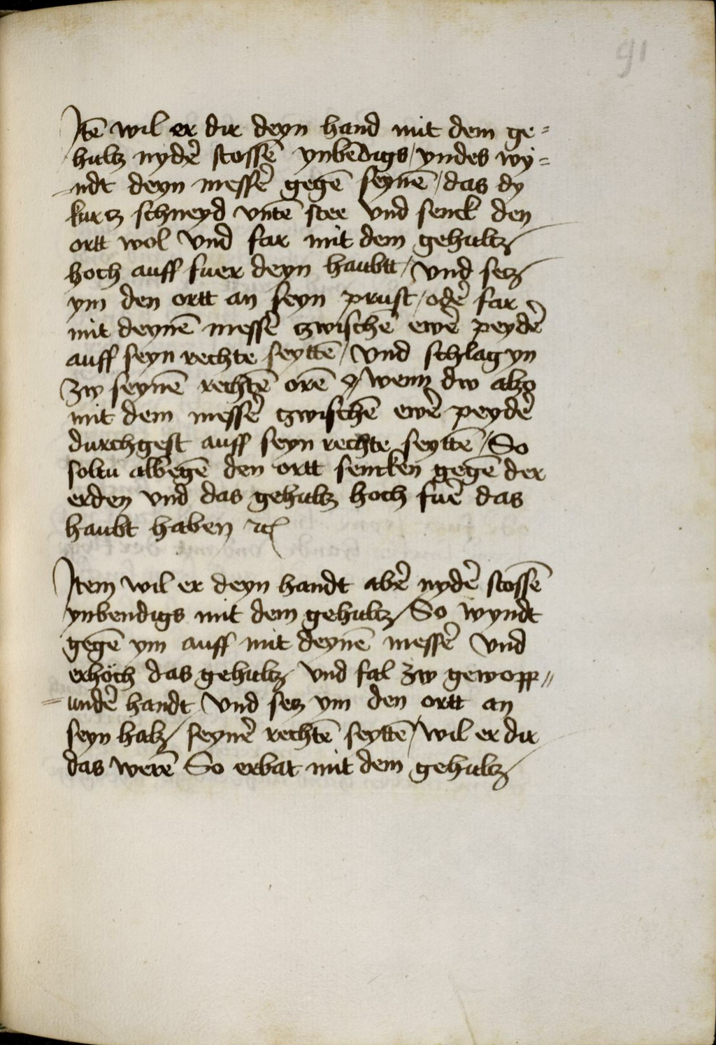 Item wil er dir deyn hand mit dem gehulcz nyder stossen ynbendigß yndeß wyndt deyn messer gegen seynem daß dy kurcz schneyd unter stee und senck den ortt wol und far mit dem gehulcz hoch auff fuer deyn haubtt und secz ym den ortt an seyn prust oder far mit deynem messer czwischen ewer peyder auff seyn rechte seytten und schlag yn zw seynem rechten oren Wenn dw also mit dem messer czwischen ewer peyder durchgest auff seyn rechte seytten So soltu albegen den ortt sencken gegen der erden und daß gehulcz hoch fuer daß haubt haben etc
