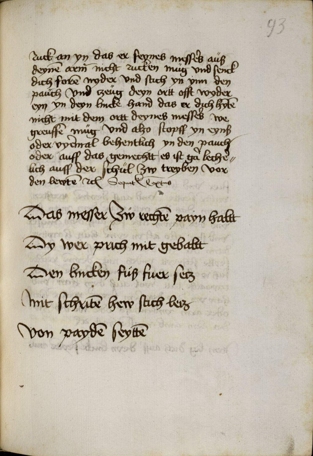 ruck an yn daß er seyneß messerß aüß deynem armen nicht rucken müg und senck dich foren nyder und stich yn ynn den paüch und czeüg deyn ortt offt wyder eyn yn deyn lincke hand daß er dich hynten nicht mit dem ortt deyneß messerß wegreuffen müg und alzo stopff yn eynß oder vyermal behentlich yn den pauch oder auff daß gemechtt eß ist gar lecherlich auff der schül zw treyben vor den lewten etc Sequitur textus