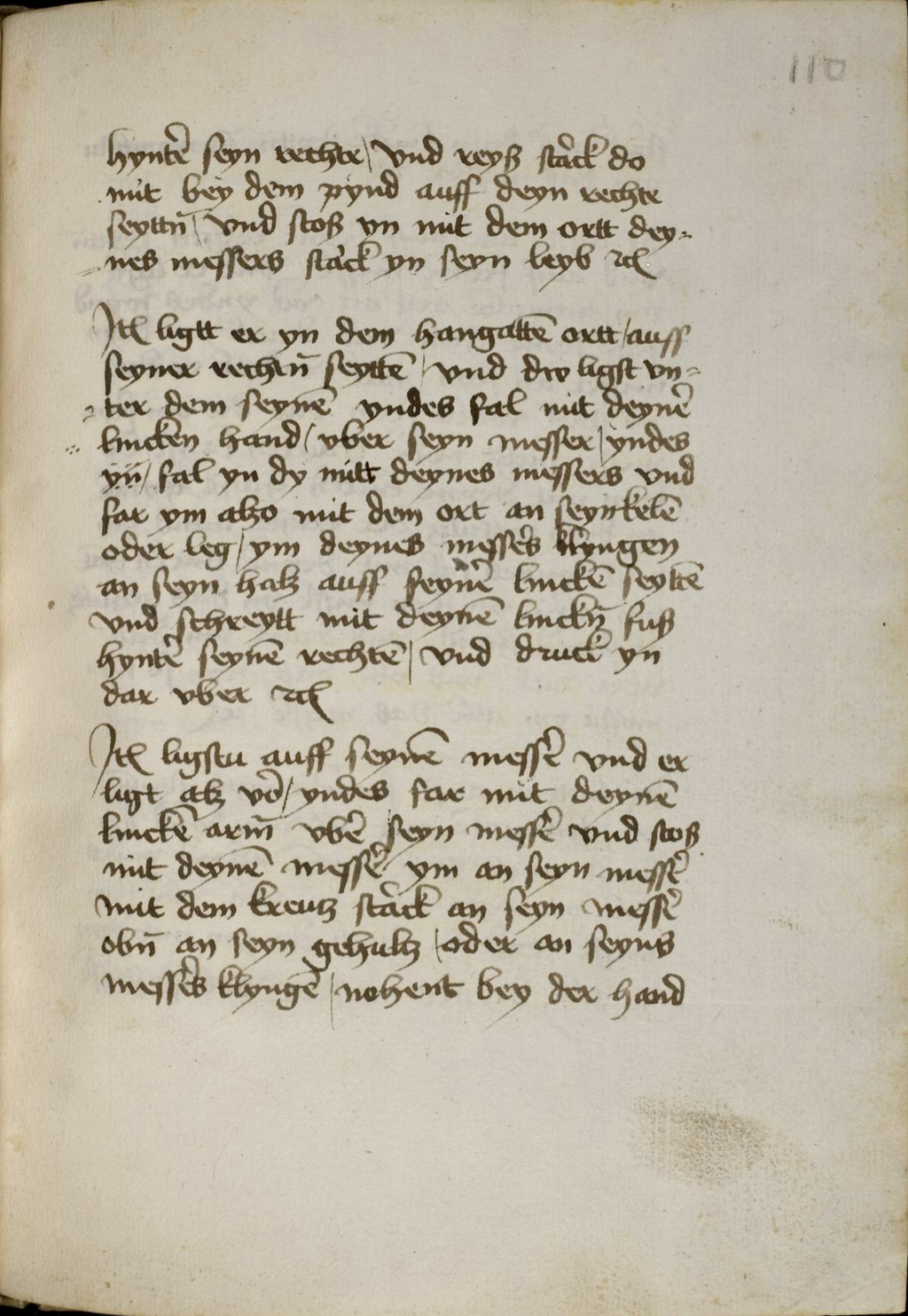 Item ligtt er yn dem hangatten ortt auff seyner rechten seytten und dw ligst unter dem seynen yndeß fal mit deyner lincken hand uber seyn messer yndeß yn fal yn dy mitt deyneß messerß und far ym alzo mit dem ort an seyn kelen oder leg ym deyneß messerß klyngen an seyn halz auff seyner lincken seytten und schreytt mit deynem lincken fuß hynter seyner rechten und druck yn dar uber etc
