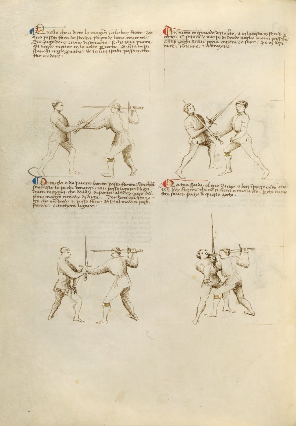 ¶ Quello che a ditto lo magistro io l’o ben fatto, zoe ch’io passai fora de strada façendo bona coverta, E lo zugadore trovo discoverto, si che una punta gli voglo metter in lo volto per certo, E cum la man stancha voglo provare, Se la tua spada posso in terra far andare.