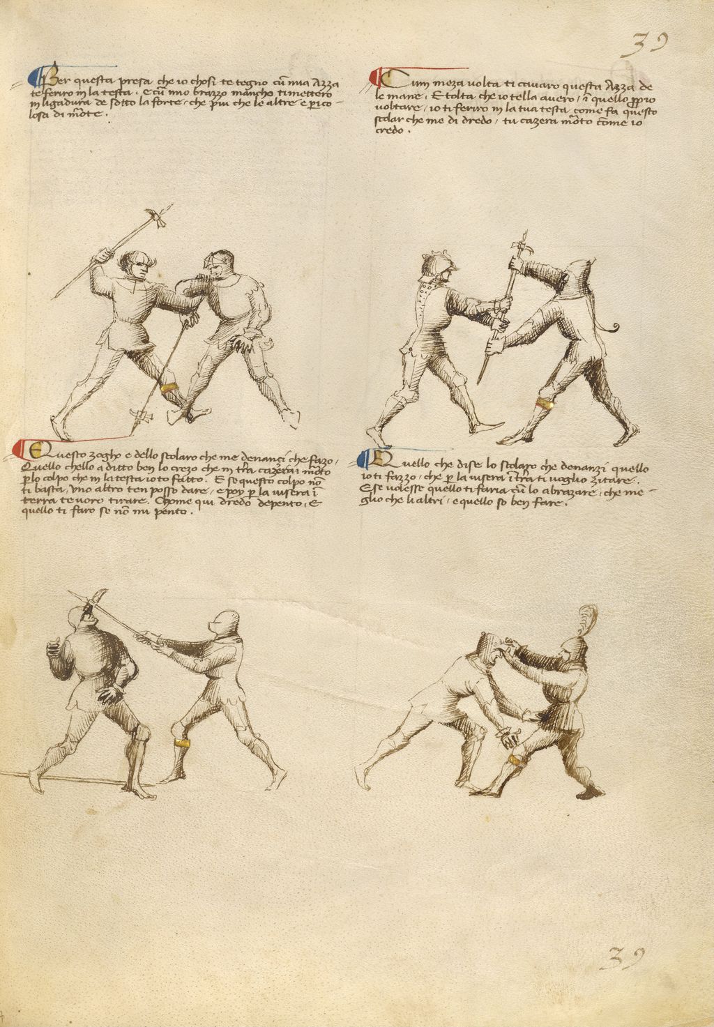 ¶ Questo zogho e dello scolaro che m'e denançi che fazo, Quello ch'ello a ditto ben lo crezo che in terra cazerai morto per lo colpo che in la testa io t'o fatto. E se questo colpo non ti basta, uno altro ten posso dare, e poii per la visera in terra te voro tirare. Chome qui dredo depento, e quello ti faro se non mi pento.