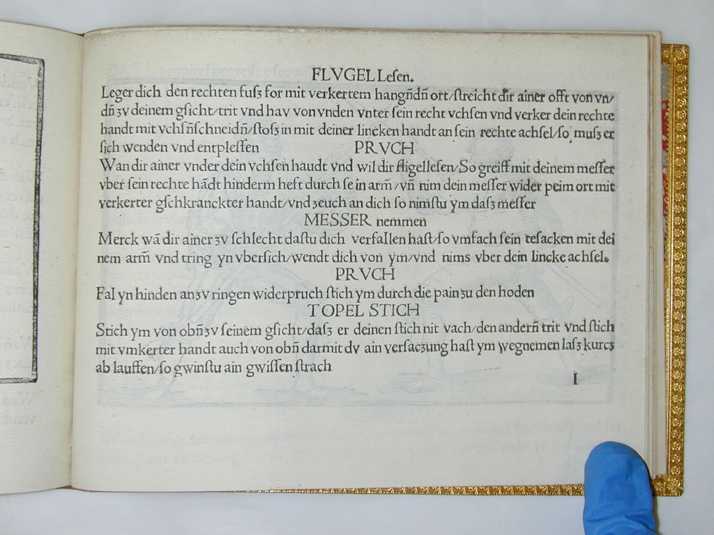 Wan dir ainer under dein uchsen haudt und wil dir fligellesen, So greiff mit deinem messer uber fein rechte handt hinderm heft durch se in armm, und nim dein messer wider peim ort mit verkerter gschkranckter handt, und zeuch an dich so nimstu ym dasz messer