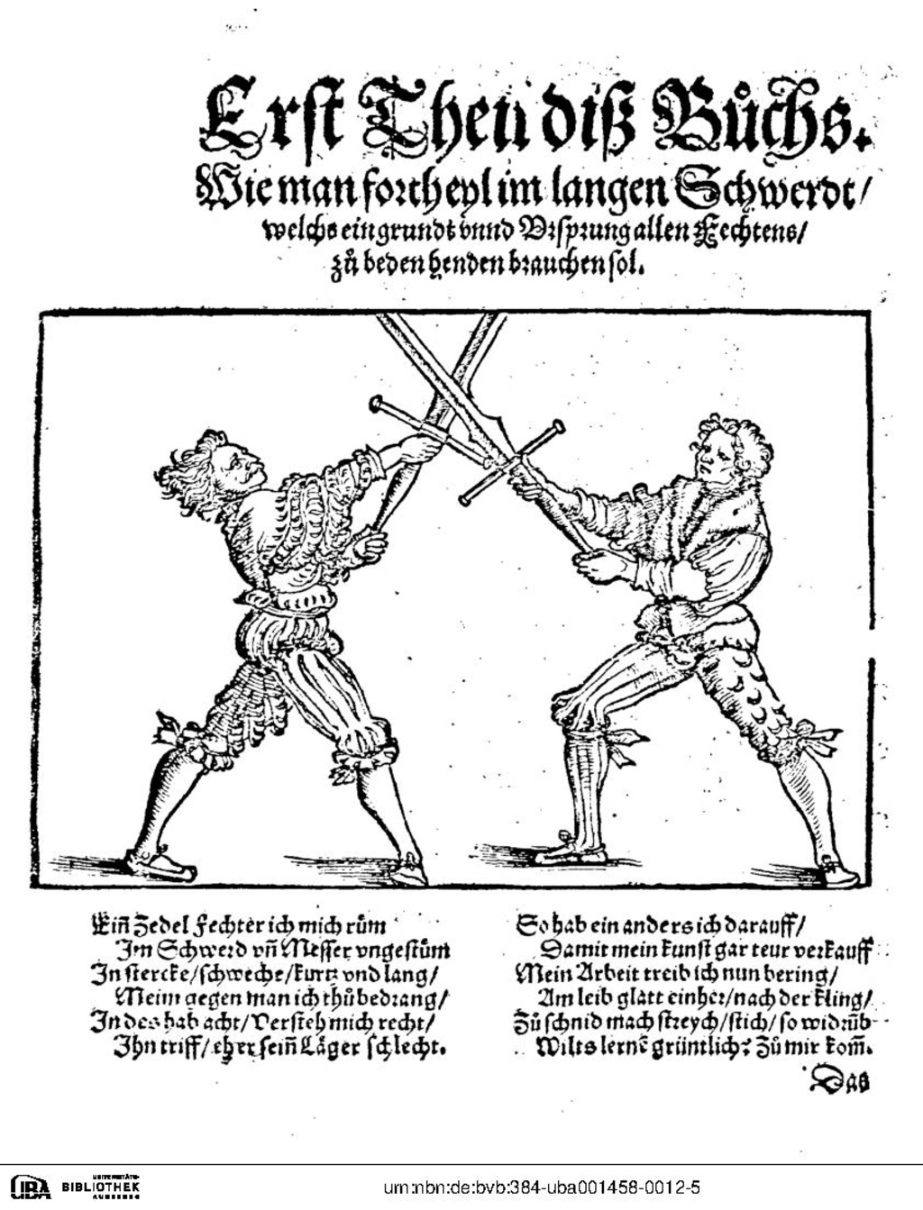 Ein Zedel fechter ich mich rüm Im Schwerd un Messer ungestüm In stercke, schweche, kurtz und lang, Mein gegen man ich thu bedrang, In des hab acht, versteh mich recht, Ihn triff, eh er sein Läger schlecht. So hab ein anders ich darauff, Damit mein kunst gar teur verkauff Mein Arbeit treib ich nun bering, Am leib glatt einher, nach der kling, Zu schnid mach streych, stich, so widrub Wilts lerne grüntlich. Zu mir komm.