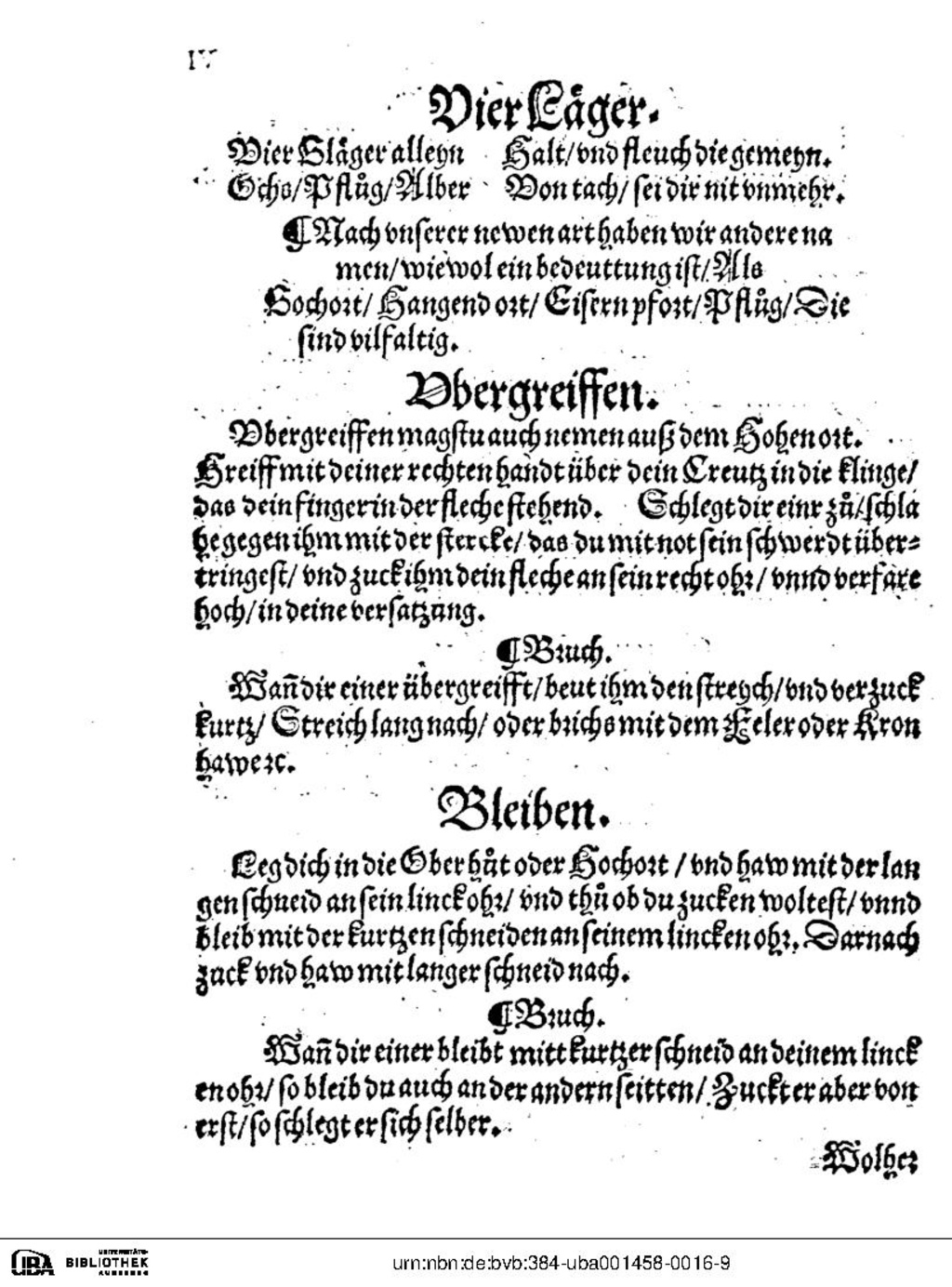 VI v Vier Läger. Vier Läger alleyn Halt, und fleuch die gemeyn. Ochs, Pflug, Alber Von tach, sei dir nit unmehr. Nach unserer newen art haben wir andere na men, wiewol ein bedeuttung ist, Als Hochort, Hangend ort, Eisern pfort, Pflug, Die sind vilfaltig. Ubergreiffen. Ubergreiffen magstu auch nehmen auß dem Hohen ort. Greiff mit deiner rechten handt über dein Kreutz in die klinge, das dein finger in der fleche stehend. Schlegt dir einr zu, schlahe gegen ihm mit der stercke das du mit not sein schwerdt übertringest, und zuck ihm dein fleche an sein recht ohr, unnd verfare hoch, in deine versatzung. Bruch. Wann dir einer übergreifft, beut ihm den streych, und verzuck kurtz Streich lang nach, oder brichs mit dem Feler oder Kron hawe. Bleiben. Leg dich in die Oberhut oder Hochort, und haw mit der langen schneid an sein linck ohr, und thu ob du zucken wolltest, unnd bleib mit der kurtzen schneiden an seinem lincken ohr. Darnach zuck und haw mit langer schneid nach. Bruch. Wann dir einer bleibt mit kurtzer schneid an deinem lincken ohr, so bleib du auch an der andern seitten, Zuckt er aber von erst, so schlegt er sich selber. Wolher