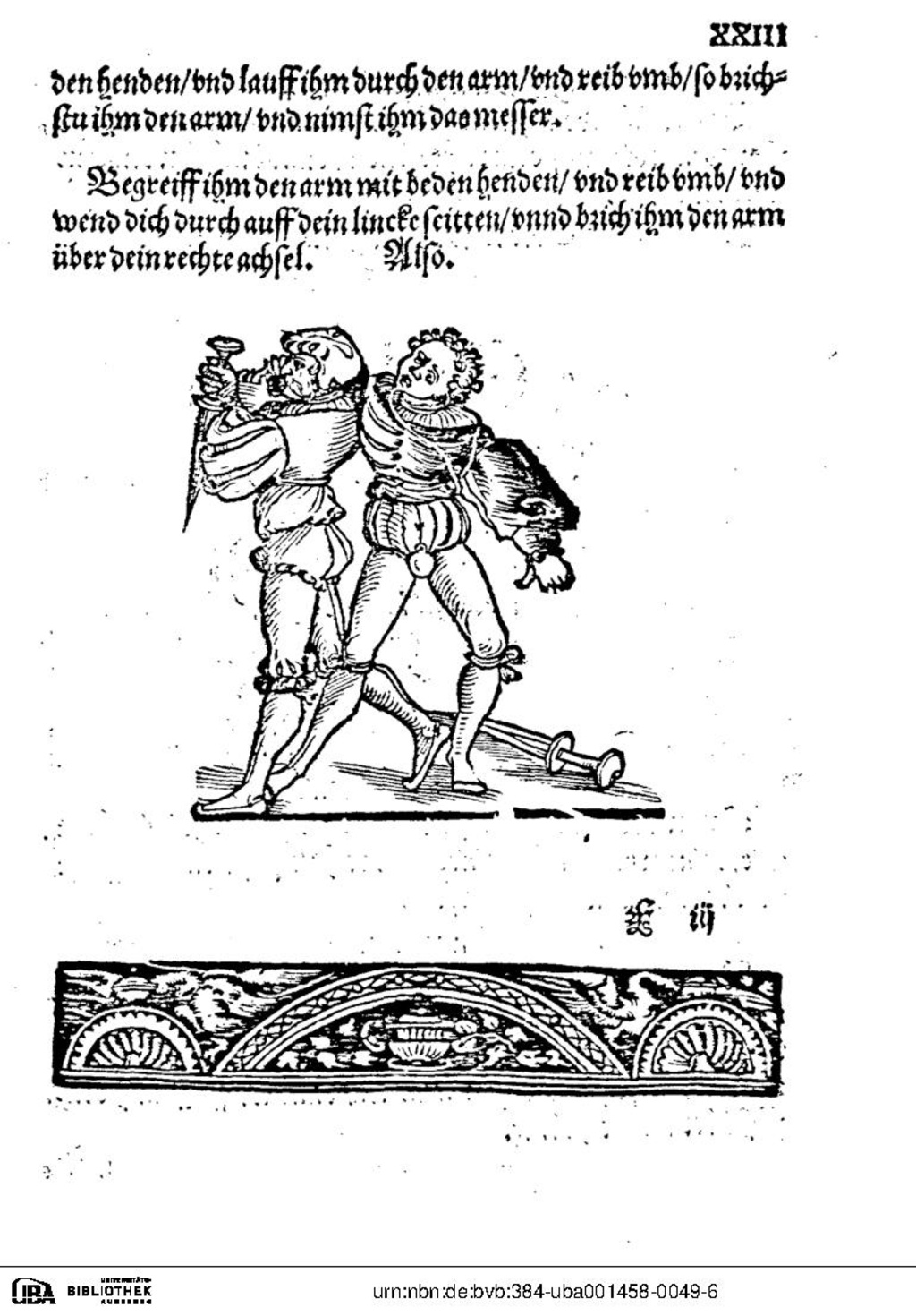 Begreiff ihm den arm mit beden henden, und reib umb, und wend dich durch auff dein lincke seitten und brich ihm den arm über dein rechte achsel. Also.