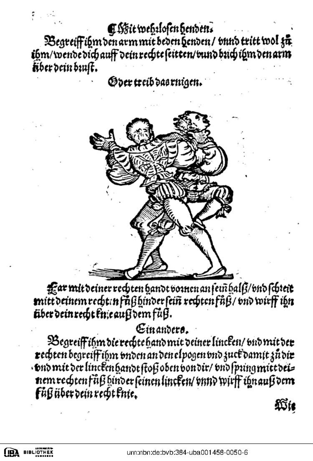 Far mit deiner rechten handt vornen an seinn hals, und schreit mit deinem rechten fuß, hinder seinn rechten fuß, unnd wirff ihn über dein recht knie auß dem fuß.