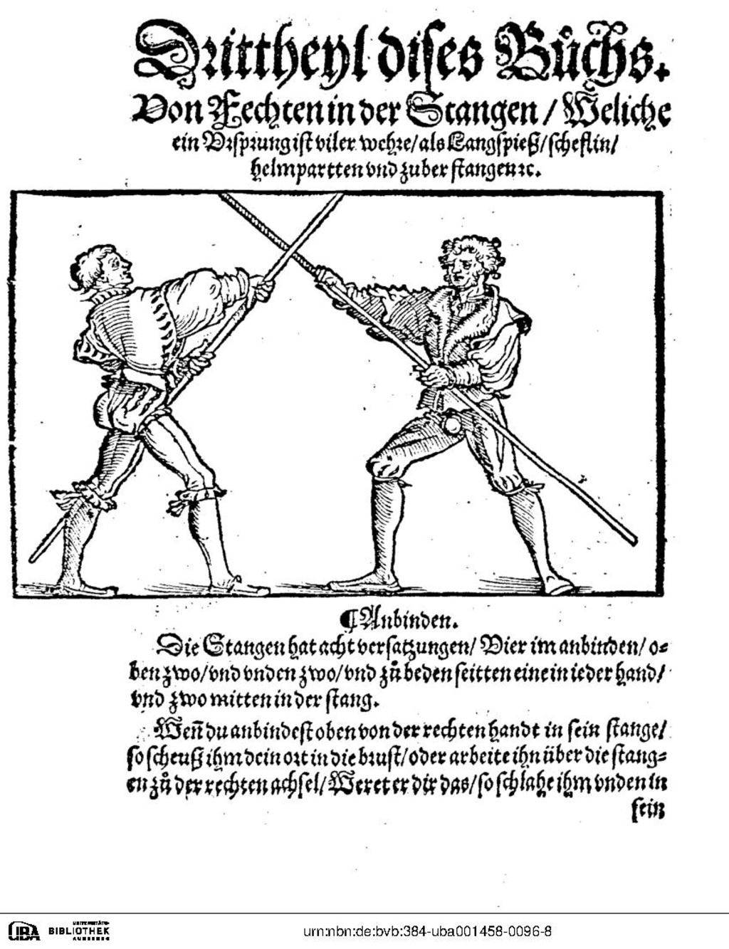 Die Stangen hat acht versatzungen, Vier im anbinden, oben zwo, und unden zwo, und zu beden seitten ein in ieder hand und zwo mitten in der stang. Wenn du anbindest oben von der rechten handt in sein stange, so scheuß ihm dein ort in die brust, oder arbeite ihn über die stangen zu der rechten achsel, Weret er dir das, so schlahe ihm unden in