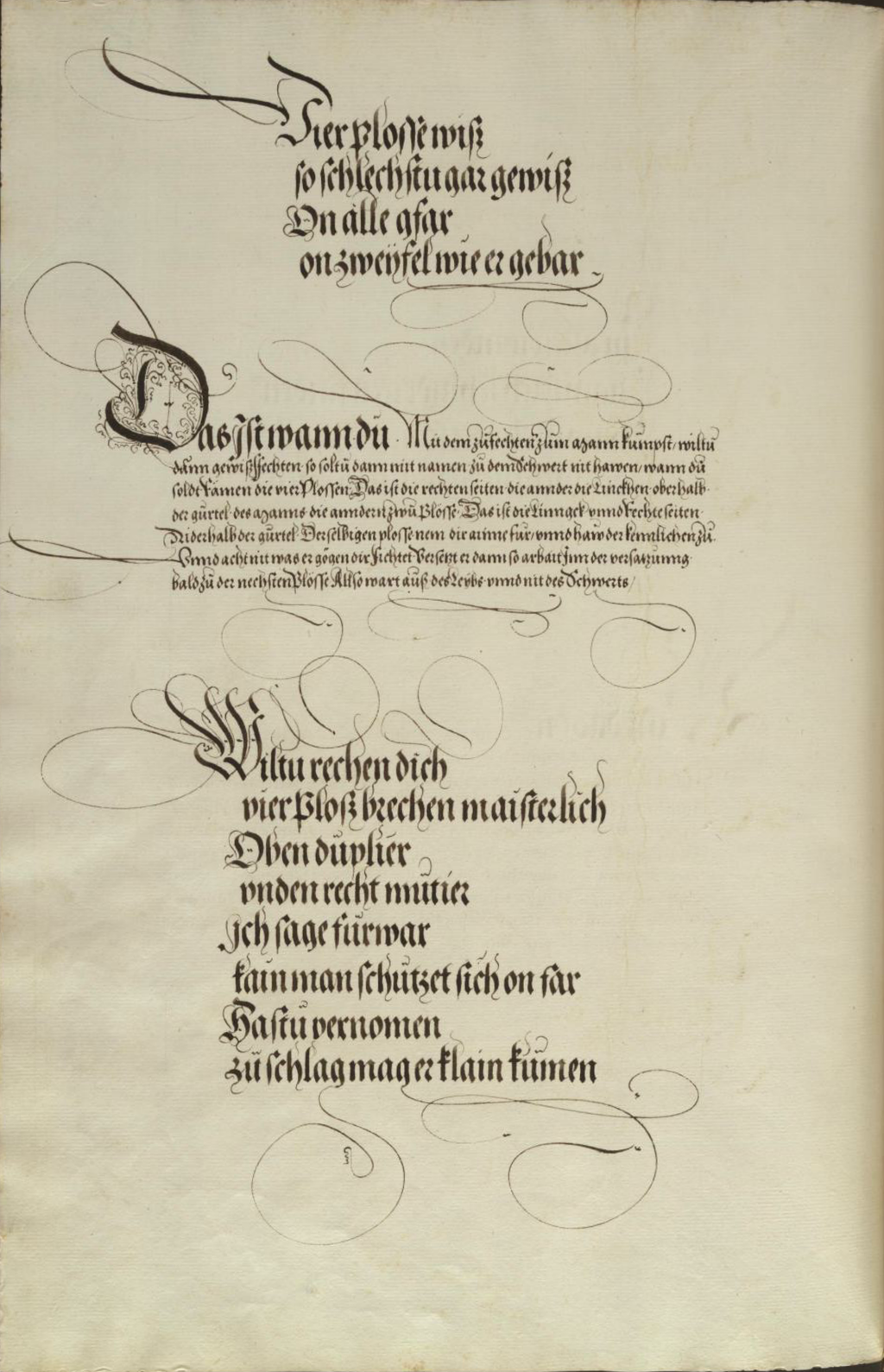 Das Ist wann. du. Mit dem zufechten zum Mann kumpst / wiltu dann gewiszs fechten. so soltu dann mit namen. zu dem Schwert nit hawen / wann du soldt. Rämen die vier Plosse. Das ist die rechten seiten. die annder die Linckhen. oberhalb. der gürtel. des Manns. die anndern zwu Plösse. Das ist die Linngck vnnd Rechte seiten. Niderhalb der gurtel. Der selbigen plosse. nem dir ainne fur / vnnd haw der kennlichen zu. Vnnd acht nit was er gögen dir fichtet. Versetzt er dann so arbait Inn der versatzunng bald zu der nechsten Plösse Allso wart ausz des leybs. vnnd nit des Schwerts.