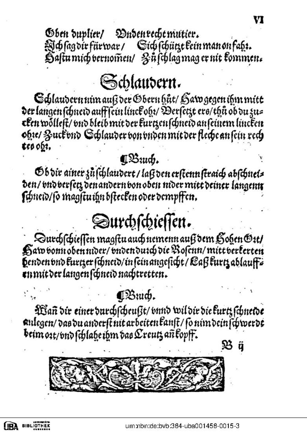 Ob dir ainer zu schlaudert, laß den erstenn straich abschneiden, und versetz den andern von oben nider mitt deiner langenn schneid, so magstu ihn bstecken[!] oder dempffen.