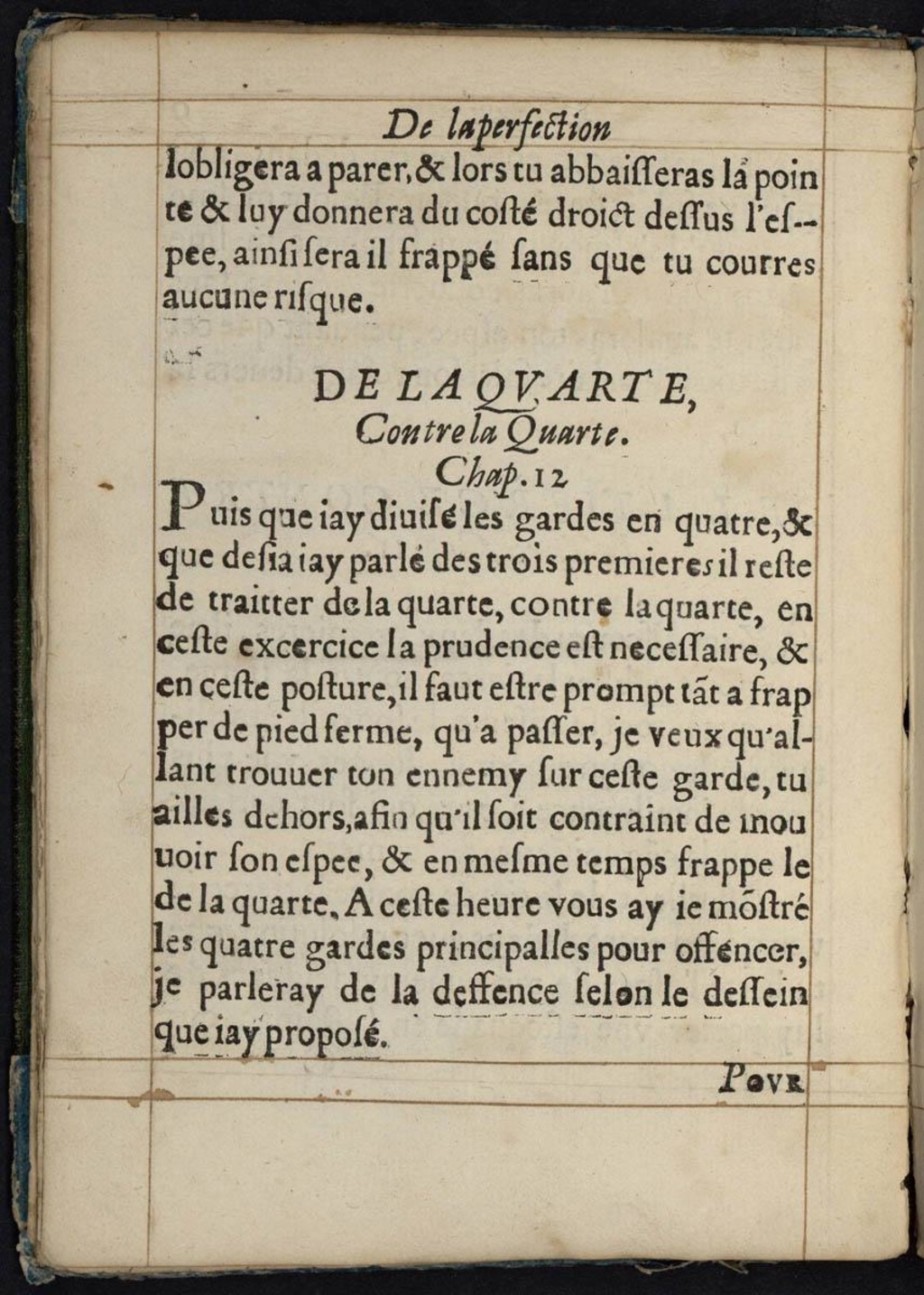 Puis que jai divisé les gardes en quatre, & que desja jay parlé des trois premieres il reste de traitter de la quarte, contre la quarte, en ceste exercice la prudence est necessaire, & en ceste posture, il faut estre prompt tant a frapper de pied ferme, qu’a passer, je veux qu’allant trouver ton ennemy sur ceste garde, tu ailles dehors, afin qu’il soit contraint de mouvoir son espee, & en mesme temps frappe le de la quarte. A ceste heure vous ay je monstré les quatre gardes principalles pour offencer, je parleray de la deffence selon le dessein que jay proposé.