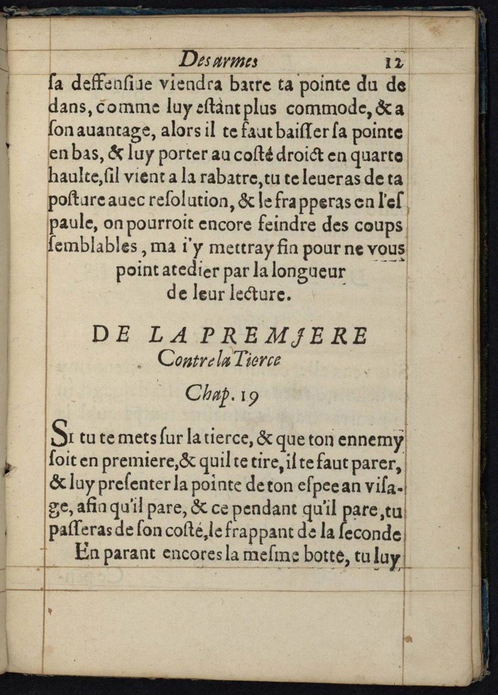 sa deffensive viendra batre ta pointe du dedans, comme luy estant plus commode, & a son avantage, alors il te faut baisser sa pointe en bas, & luy porter au costé droict en quarte haulte, sil vient a la rabatre, tu te leveras de ta posture avec resolution, & le frapperas en l’espaule, on pourroit encore feindre des coups semblables, ma j’y mettray fin pour ne vous point atedier par la longueur de leur lecture.