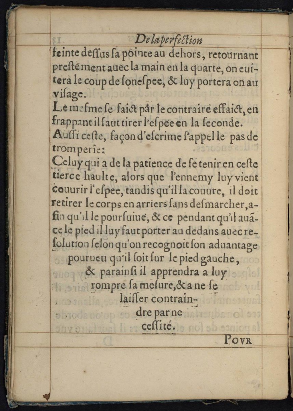 Celuy qui a de la patience de se tenir en ceste tierce haulte, alors que l’ennemy luy vient couvrir l’espee, tandis qu’il la couvre, il doit retirer le corps en arriers sans desmarcher, afin qu’il le poursuive, & ce pendant qu’il avance le pied il luy faut porter au dedans avec resolution selon qu’on recognoit son advantage pourveu qu’il soit sur le pied gauche, & parainsi il apprendra a luy rompre sa mesure, & a ne se laisser contraindre par necessité.