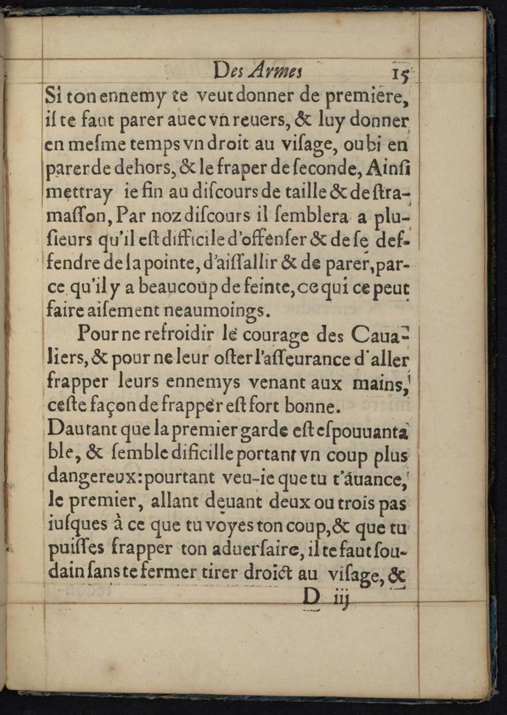Si ton ennemy te veut donner de premiere, il te faut parer avec un revers, & luy donner en mesme temps un droit au visage, ou bien parer de dehors, & le fraper de seconde. Ainsi mettray je fin au discours de taille & destramasson. Par noz discours il semblera a plusieurs qu’il est difficile d’offenser & de se deffendre de la pointe, d’aissallir & de parer, parce qu’il y a beaucoup de feinte, ce qui ce peut faire aisement neaumoings.