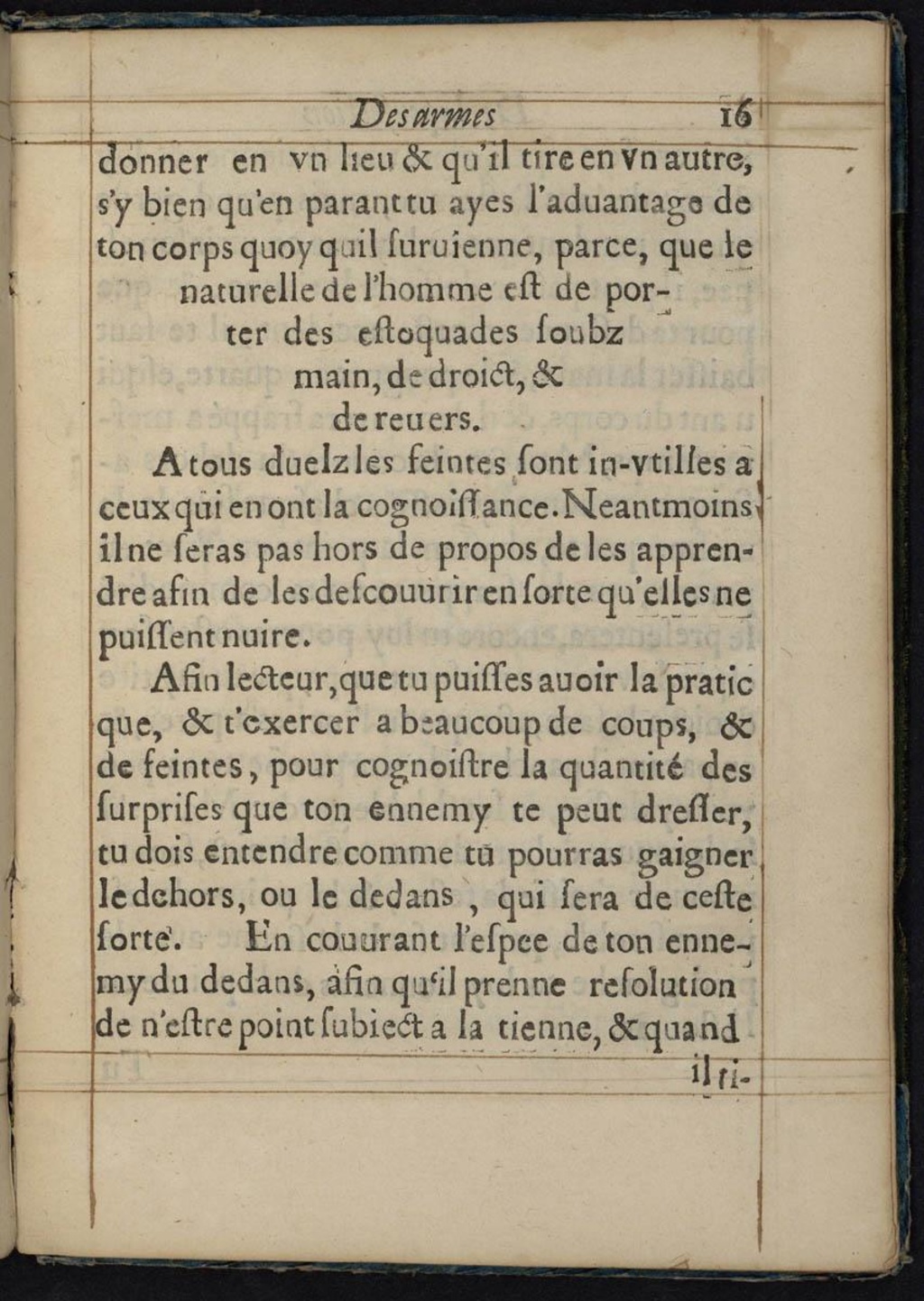 A tous duelz les feintes sont in-utilles a ceux qui en ont la cognoissance. Neantmoins il ne seras pas hors de propos de les apprendre afin de les descouvrir en sorte qu’elles ne puissent nuire.