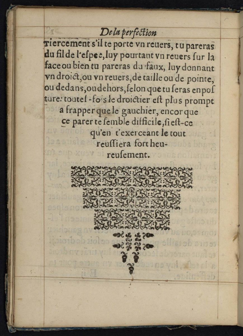 Tiercement s’il te porte un revers, tu pareras du fil de l’espee, luy pourtant un revers sur la face ou bien tu pareras du faux, luy donnant un droict, ou un revers, de taille ou de pointe, ou dedans, ou dehors, selon que tu seras en posture : toutes-fois le droictier est plus prompt a frapper que le gauchier, encor que ce parer te semble difficile, si est-ce qu’en t’exerceant le tout reussiera fort heureusement.