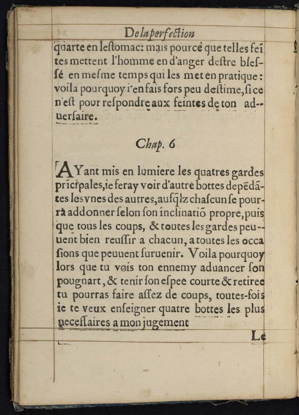AYant mis en lumiere les quatre gardes principales, je feray voir d’autre bottes dependantes les unes des autres, ausquelz chascun se pourra addonner selon son inclination propre, puisque tous les coups, & toutes les gardes peuvent bien reussir a chacun, a toutes les occasions que peuvent survenir. Voila pourquoy lors que tu vois ton ennemy advancer son pougnart, & tenir son espee courte & retiree tu pourras faire assez de coups, toutes-fois je te veux enseigner quatre bottes les plus necessaires a mon jugement