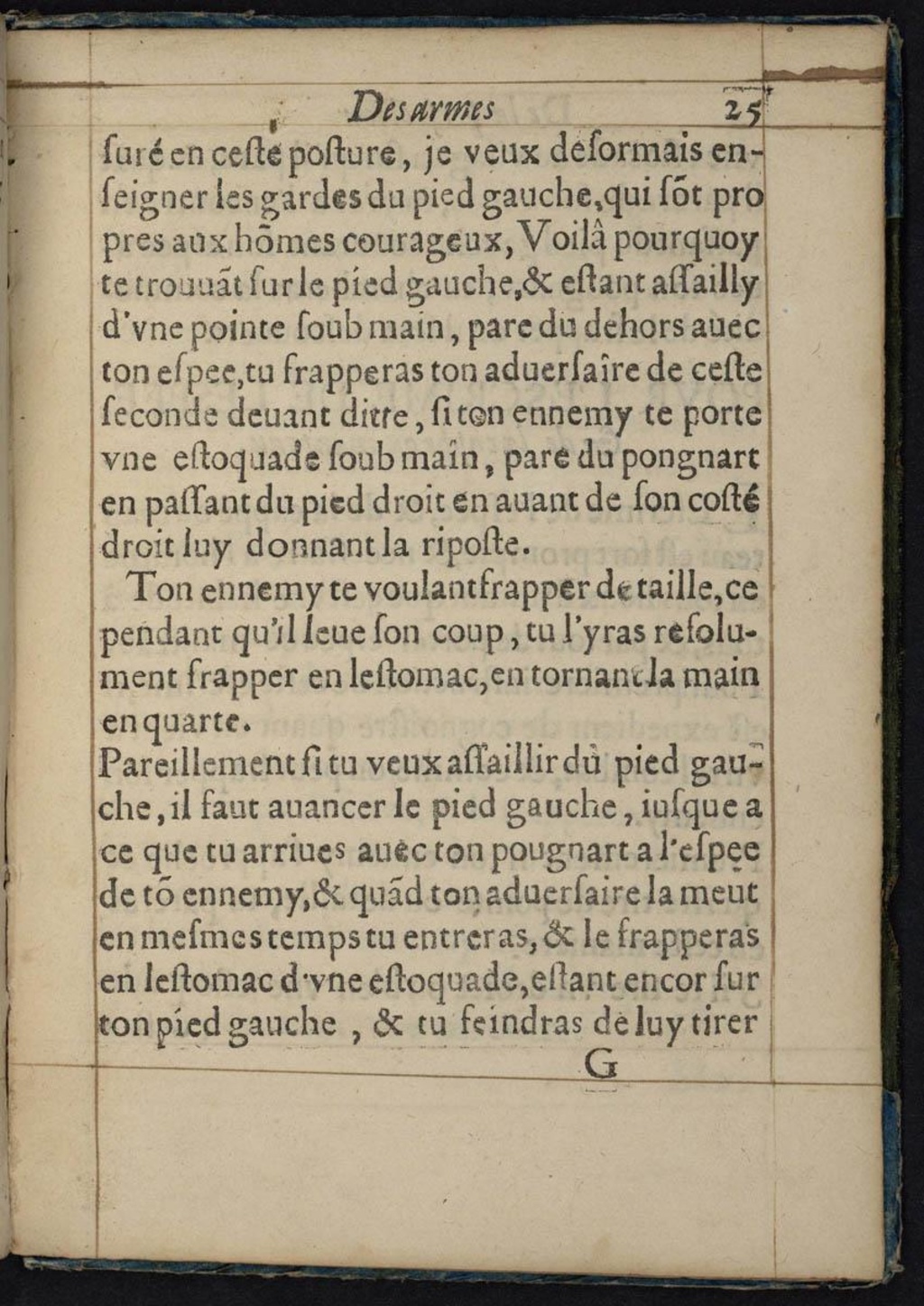 assuré en ceste posture, je veux desormais enseigner les gardes du pied gauche, qui sont propres aux hommes courageux, Voilà pourquoy te trouvant sur le pied gauche, & estant assailly d’une pointe soub main, pare du dehors avec ton espee, tu frapperas ton adversaire de ceste seconde devant ditte, si ton ennemy te porte une estoquade soub main, pare du pongnart en passant du pied droit en avant de son costé droit luy donnant la riposte.