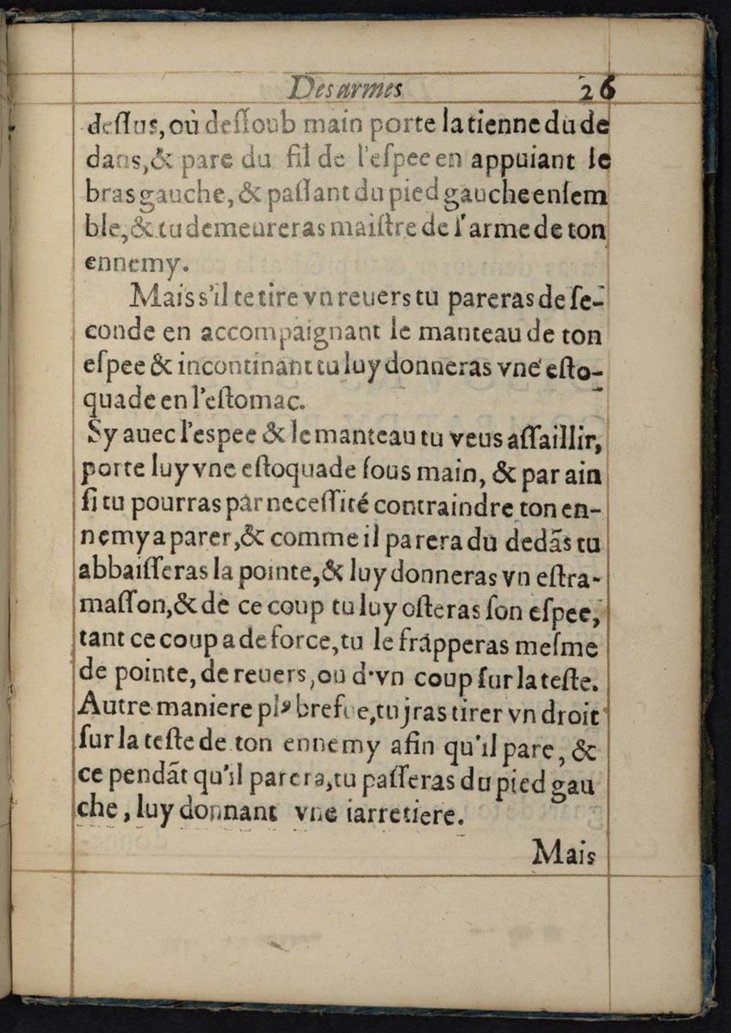 Mais s’il te tire un revers tu pareras de seconde en accompaignant le manteau de ton espee & incontinant tu luy donneras une estoquade en l’estomac.