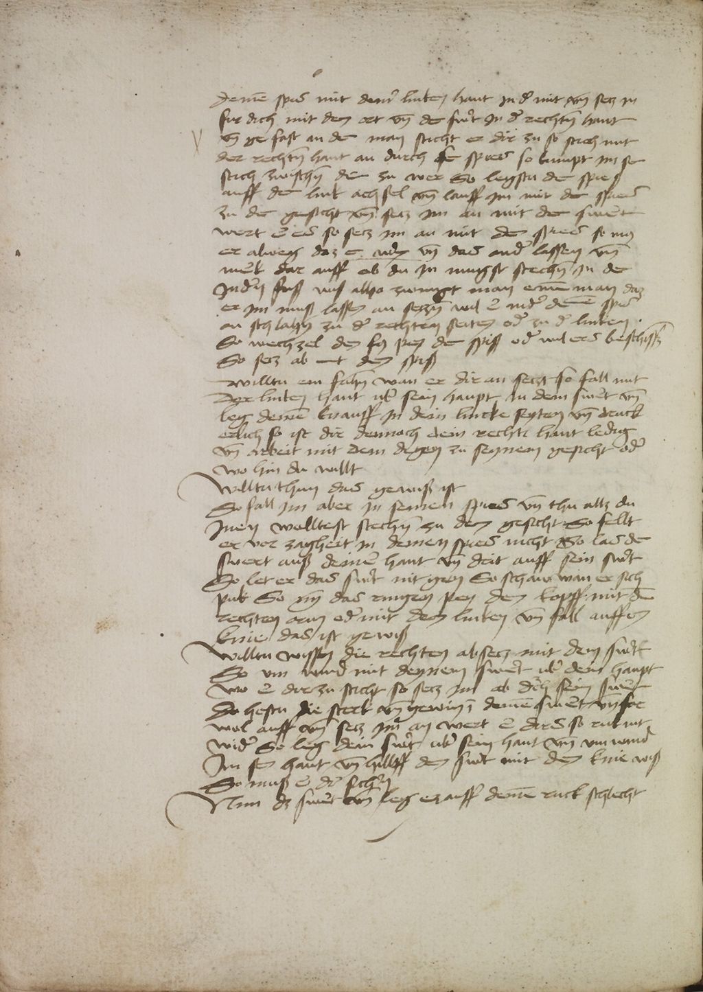 willtu wissen die rechten absecz mit dem swert So vm wind mit deynem swert uber dein haupt wo er dir zu sticht so secz jm ab dreh[2] sein swert So hestu die sterk vnd gewinst deinen swert vnd for wol auff vnd secz jm an wert er dirs so ruk nit wider So leg dein swert uber sein hant vnd vm wind jm sein hant vnd hillff dem swert mit dem knie wiß So muß er dir sichern