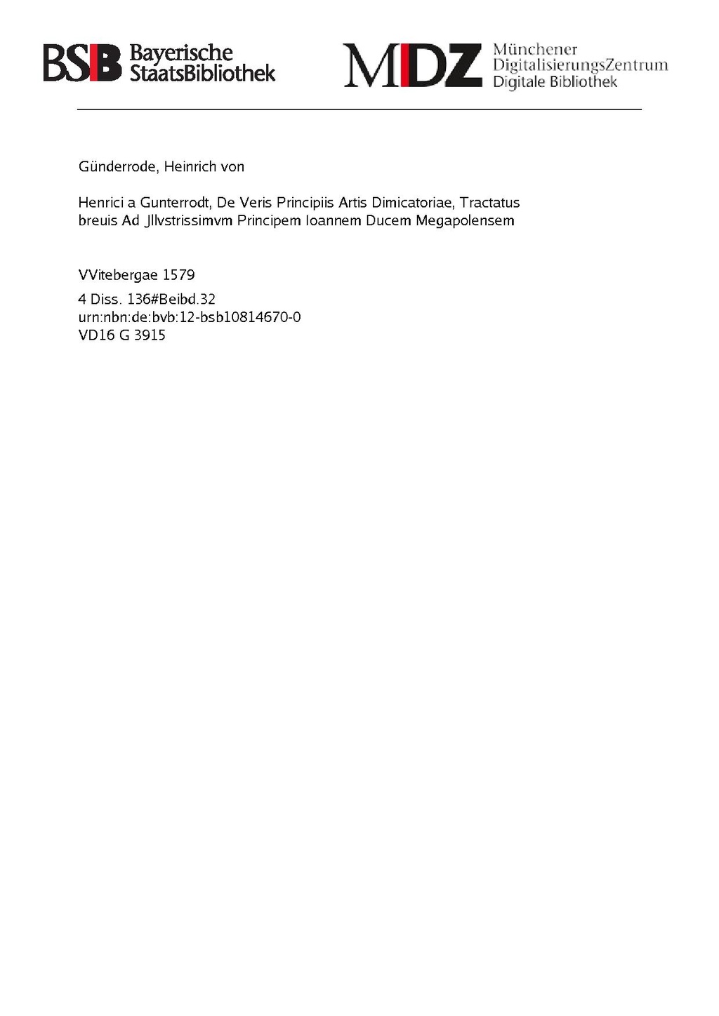+HQULFL�D�*XQWHUURGW��'H�9HULV�3ULQFLSLLV�$UWLV�'LPLFDWRULDH��7UDFWDWXV� EUHXLV�$G�-OOYVWULVVLPYP�3ULQFLSHP�,RDQQHP�'XFHP�0HJDSROHQVHP
