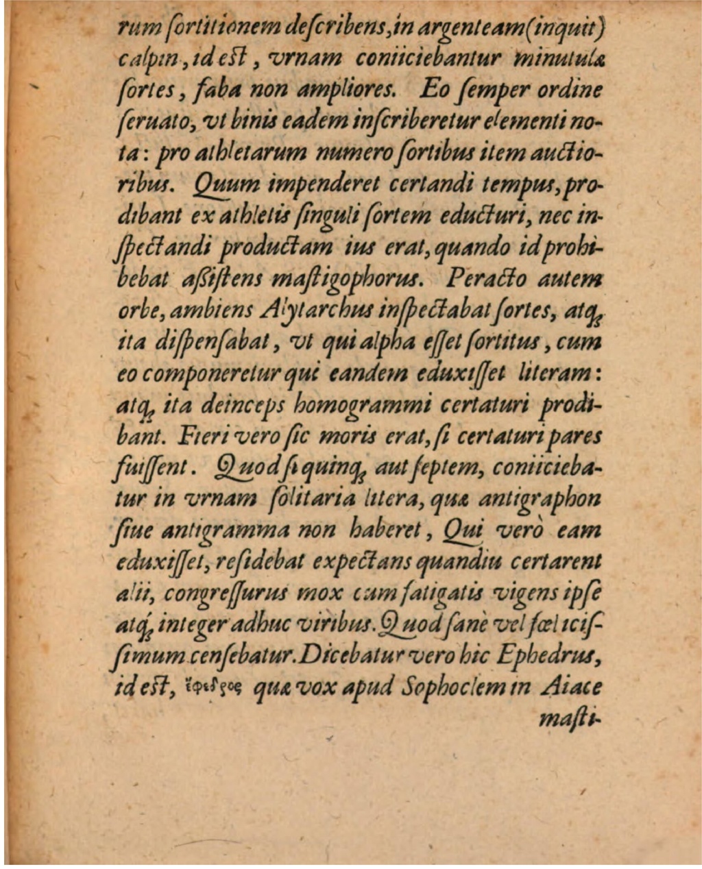 rum sortitionem describens, in argenteam (inquit) calpin, id est, urnam coniiciebantur minutulae sortes, faba non ampliores. Eo semper orfine servato, ut binis eadem inscriberetur elementi nota: pro athletarum numero sortibus item auctioribus. Quum impenderet certandi tepus, prodibant ex athletis singuli sortem educturi, nec inspectandi productam ius reat, quando id prohibebat assistems mastigophorus. Peracto autem orbe, ambiens Alytarchus inspectabat sortes, atque ita dispensabat, ut qui alpha esset sortitus, cum eo componeretur qui eandem eduxisset literam: atque ita deinceps homogrammi certaturi prodibant. Fieri vero sic moris erat, si certaturi pares suissent. Quod si quinque aut septem, coniiciebantur in urnam solitaria litera, quae antigraphon sive antigramma non baeret, Qui vero eam eduxisset, residebat expectans quandiu certarent alii, congressurus mox cum fatigatis vigens ipse atque integer adhuc viribus. Quod sane vel foel icissimum censebatur. Dicebatur vero hic Ephedrus, id est, quae vox apud Sophclem in Aiace