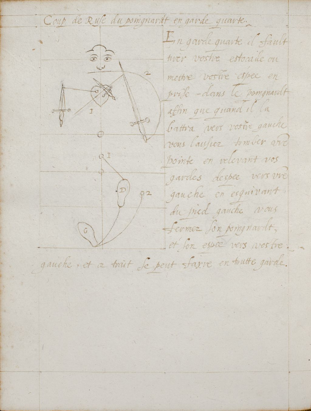 Coup de ruse du poingnardt en garde quarte. En garde quarte il fault tirer vostre estocade ou mettre vostre espée en prise dans le poingnardt affin que quand il la battra vers vostre gauche vous laissiez tomber vostre pointe en relevant vos gardes d'espée vers vostre gauche en esquivant du pied gauche vous fermez son poingnardt, et son espée vers vostre gauche, et ce trait se peut fayre en toutte garde.
