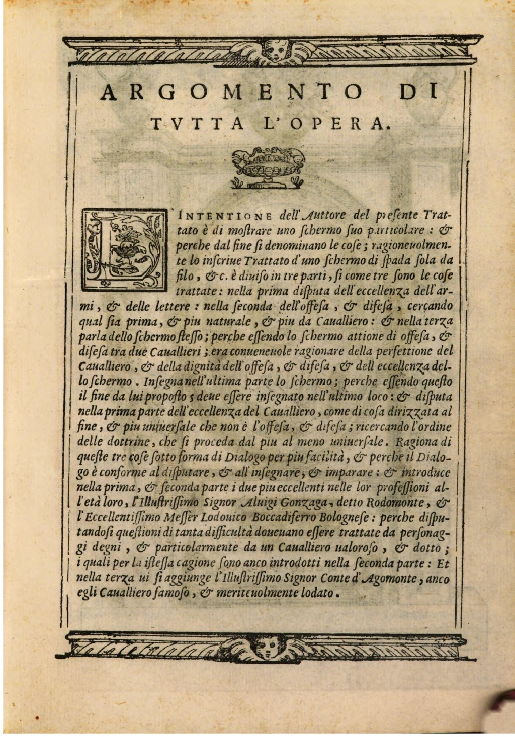 INTENTIONE dell'Auttore del prefente Trattato è di moftrare uno schermo fuo particolare : & perche dalfinefidenominano le cofe ; ragioneuolmente lo inferiue Trattato d'uno schermo di ſpada fola da filo , &c. è diuifo in tre parti , fi come tre fono le cofe trattate : nella prima difputa dell'eccellenza dell'armi, & delle lettere : nella feconda dell'offefa , & difefa , cercando qualfia prima, & piu naturale , & piu da Caualliero : & nella terza parla delloschermofteſſo; perche effendo lo schermo attione di offefa, & difefa tra due Cauallieris era conueneuole ragionare della perfettione del Caualliero , & della dignità dell'offefa , & difefa , & dell eccellenza dello fchermo . Infegna nell'ultima parte lo fchermo ; perche effendo quefto il fine da luipropoftos deue effere infegnato nell'ultimo loco : & difputa nella primaparte dell'eccellenza del Caualliero , come di cofa dirizzata al fine , & piu uniuerfale che non è l'offesa , & difefa ; ricercando l'ordine delle dottrine , che fi proceda dal piu al meno uniuerfale . Ragiona di quefte tre cofefotto forma di Dialogo per piufacilità , & perche il Dialogo è conforme al difputare , & all'insegnare , & imparare : & introduce nellaprima, & feconda parte i due piu eccellenti nelle lor profeſſioni all'età loro , l'Illuftriffimo Signor Aluigi Gonzaga , detto Rodomonte , & l'Eccellentiffimò Meffer Lodouico Boccadiferro Bolognefe : perche difputandofi queftioni di tanta difficultà doueuano effere trattate da perfonaggi degni , & particolarmente da un Caualliero ualorofo , & dotto ; i quali per la ifleffa cagione fono anco introdotti nella feconda parte : Et nella terza ui fi aggiunge l'Illuftriffimo Signor Conte d'Agomonte , anco egli Cauallierofamofo , & meritevolmente lodato .