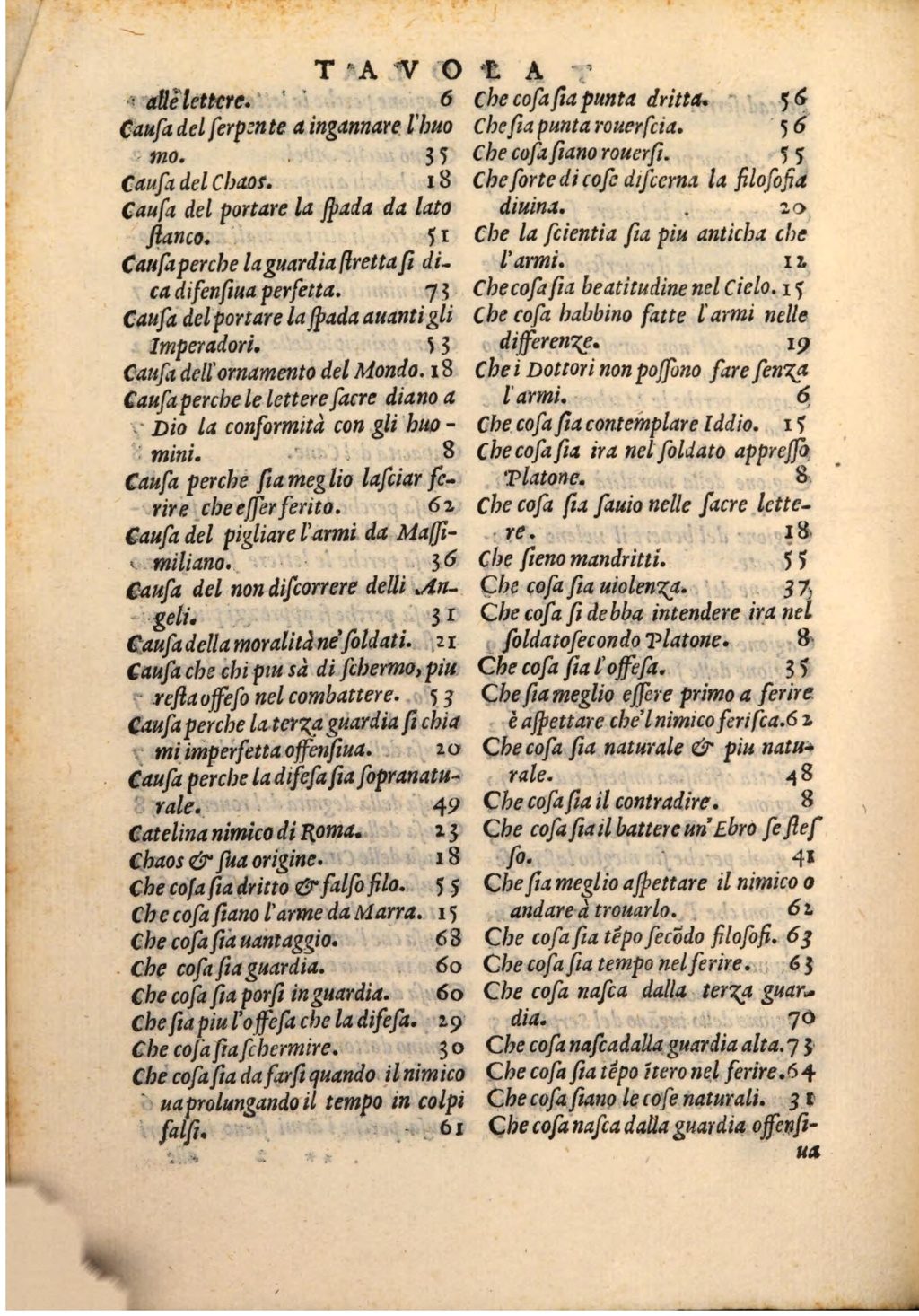 Caufa che chi piu sà di schermo, piu reftaoffefo nel combattere. 53 Chefiameglio effere primo a ferire Caufaperche la terzaguardiafi chia è afpettare che'l nimicoferiſca.6 mi imperfetta offenfiua. 20 Checofa fia naturale & piu naturale. 48 Caufa perche ladifefafiafopranatu8 rale. il contradire. Che cofafia 49 Catelina nimico di Roma. 23 Che cofafiail battere un' Ebro ſeſtef 18 41 Chaos & fua origine. So. Che cofafia dritto & falfofilo. 55 Che cosafiano l'arme da Marra. 15 68 Che cofafia uantaggio.