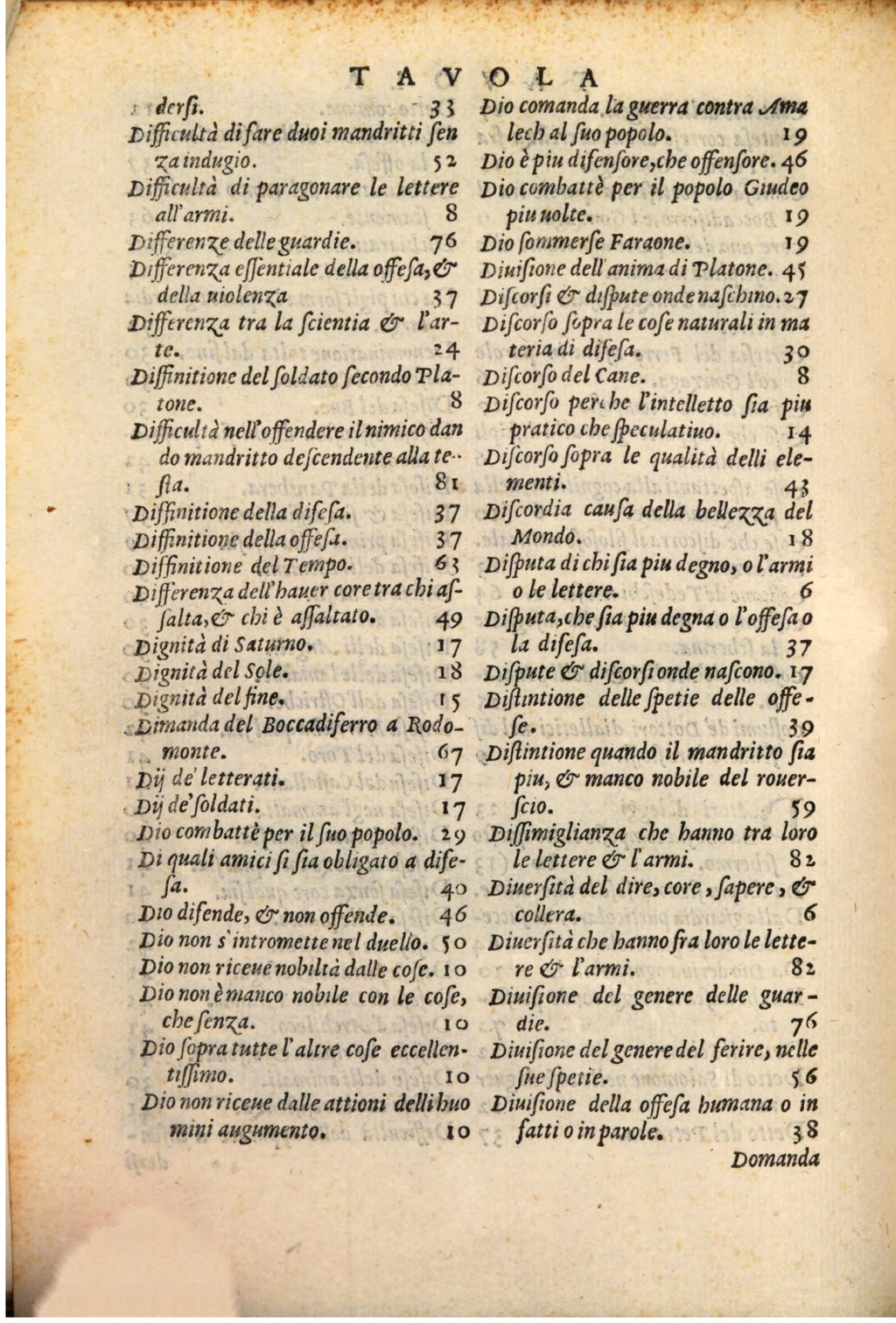 Difficultà di paragonare le lettere S all'armi. 76 Differenze delle guardie. Differenza effentiale della offefa,& della uiolenza 37