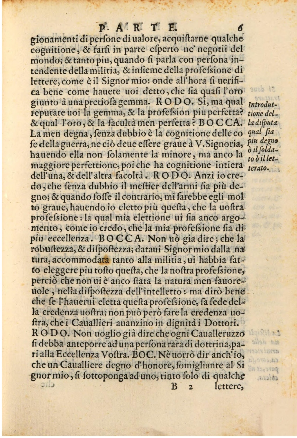 gionamenti di perſone di ualore, acquistarne qualche cognitione , & farfi in parte efperto ne' negotii del: mondo; & tanto piu, quando fi parla con perfona intendente della militia, & infieme della profefsione di lettere, come è il Signor mio : onde all'hora fi uerifica bene come hauete uoi detto , che fia quafi l'oro giunto à una pretiofa gemma. RODO. Si, ma qual Introdutreputate uoi la gemma, & la profeſsion piu perfetta? tione del& qual l'oro , & la facultà men perfetta ? BOCCA. la difputa La men degna , fenza dubbio è la cognitione delle co qual fia fe della guerra, ne ciò deue effere graue à V.Signoria, pin degno ò ilfoldahauendo ella non folamente la minore , ma anco la to ò illet maggiore perfettione, poi che ha cognitione intiera terato. dell'una, & dell'altra facoltà . RODO. Anzi io credo , che ſenza dubbio il meftier dell'armi fia più degno; & quando foffe il contrario, mi farebbe egli mol to graue, hauendo io eletto più quefta , che la uoftra profefsione : la qual mia elettione ui fia anco argomento , come io credo , che la mia profefsione fia di piu eccellenza . BOCCA. Non uò gia dire ; che la robuftezza, & difpoftezza; dataui Signor mio dalla na tura, accommodata tanto alla militia , ui habbia fatto eleggere piutofto quefta, che la noftra profefsione, perciò che non ui è anco ſtata la natura men fauoreuole , nella difpoftezza dell'intelletto : ma dirò bene che ſe l'hauerui eletta quefta profefsione, fa fede della credenza uoftra; non può però fare la credenza uoftra, che i Cauallieri auanzino in dignità i Dottori. RODO. Non uoglio già dire che ogni Caualleruzzo fidebba anteporre ad una perfona rara di dottrina, pari alla Eccellenza Voftra. BOC. Nè uorrò dir anch'io, cheun Caualliere degno d'honore, fomigliante al Si gnormio , fi fottoponga ad uno, tinto folo di qualche B 2 lettere,
