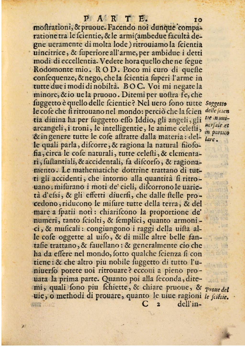 fia , circa le cofe naturali , tutte celefti , & elementari , fuftantiali, & accidentali, fa difcorfo , & ragionamento . Le mathematiche dottrine trattano di tutti gli accidenti , che intorno alla quantità fi ritrouano ; mifurano i moti de' cieli, difcorrono le uarietà d'efsi , & gli effetti diuerfi , che dalle ſtelle procedono , riducono le mifure tutte della terra , & del mare a fpatii noti : chiarifcono la proportione de' numeri , tanto fciolti , & femplici , quanto armoni ci , & muſicali : congiungono i raggi della uiſta alle cofe oggette al uifo , & di mille altre belle fantafie trattano , & fauellano : & generalmente ciò che ha da effere nel mondo, fotto qualche fcienza fi con tiene : & che altro più nobile fuggetto di tutto l'uniuerfo potete uoi ritrouare ? eccoui a pieno prouata la prima parte. Quanto poi alla feconda , ditemi , quali fono piu fchiette , & chiare pruoue , & Proue del uie , o methodi di prouare , quanto le uiue ragioni le faeue. C 2 dell'in-