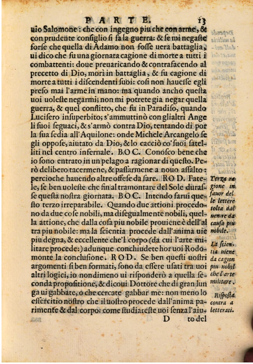 uio Salomone : che con ingegno piu che con arme , & con prudente configlio fi fa la guerra: & fe mi negaſte forfe che quella di Adamo non foſſe uera battaglia , ui dico che fu una giornata cagione di morte a tutti i combattenti : doue preuaricando & contrafacendo al precetto di Dio, morì in battaglia , & fu cagione di morte a tutti i difcendenti fuoi : cofi non haueffe egli preſo mai l'arme in mano : ma quando ancho queſta uoi uoleſte negarmi ; non mi potrete gia negar quella guerra, & quel conflitto, che fu in Paradifo, quando Lucifero infuperbito; s'ammuttinò con glialtri Ange li fuoi feguaci, & s'armò contra Dio, tentando di por la fua fedia all'Aquilone : onde Michele Arcangelo fe gli oppofe, aiutato da Dio, & lo cacciò co' fuoi fatelliti nel centro infernale . B.O C. Conofco bene che io fono entrato in unpelago a ragionar di quefto. Però delibero tacermene, & paffarmene a nouo affalto : perciochę hauendo altre offefe da fare. RO D. Fate- Terza ra le, fe ben uoleſte che fin al tramontare del Sole duraf- gione in fauor del fe quefta noftra giornata . BOC. Intendo farui que- le lettere fto terzo irreparabile. Quando due attioni procedo- tolta dal no da due cofe nobili , ma diſegualmente nobili , quel- uen re da la attione, che dalla cofa piu nobile prouiene è dell'al cauſa piu tra piu nobile: ma la fcientia procede dall'anima uie nobile. 1
