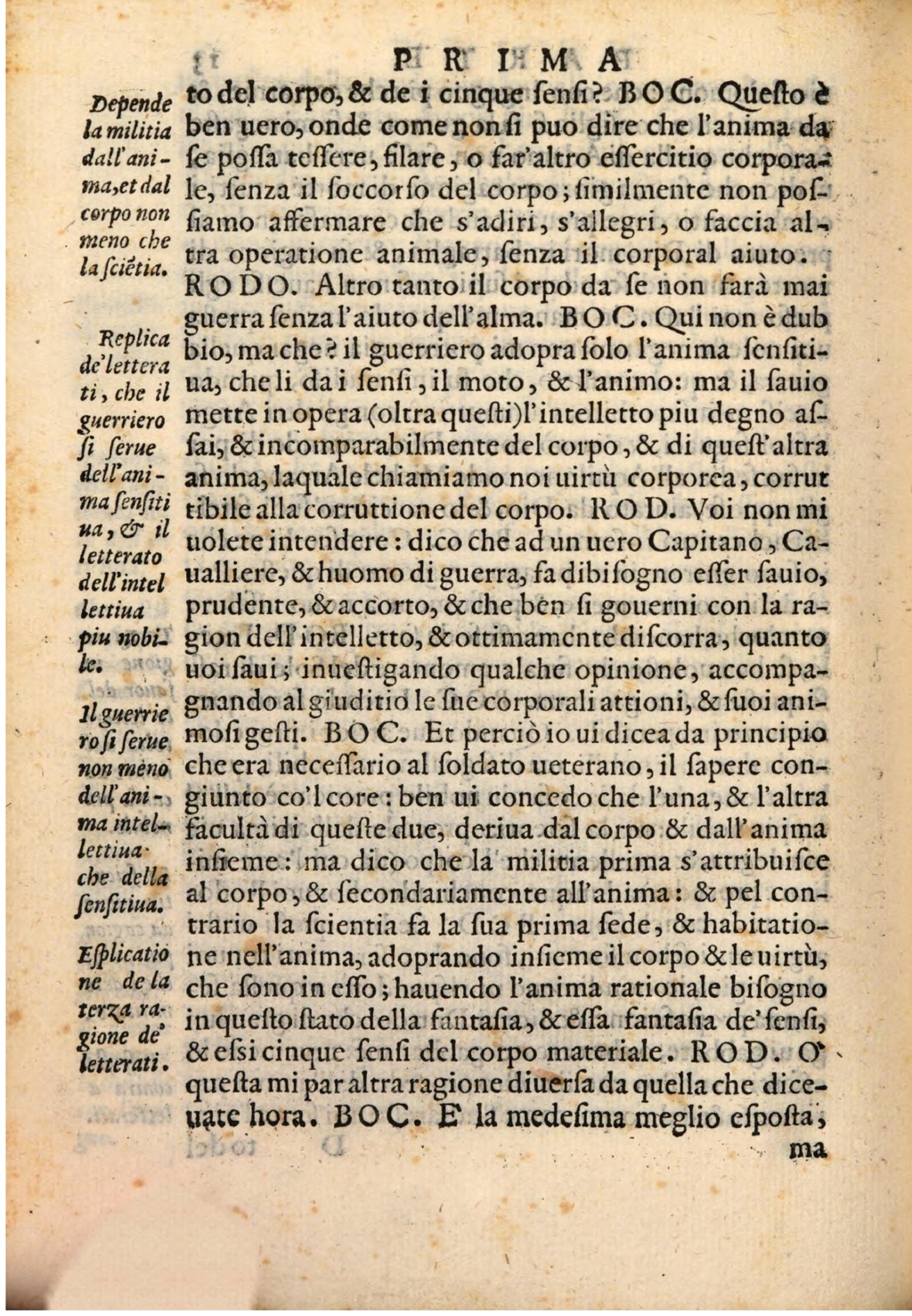 PRIM' AT Depende to del corpo, & de i cinque fenfi ? BOC. Queſto è la militia ben uero, onde come non fi puo dire che l'anima da dall'ani- fe poffa teffere , filare , o far'altro effercitio corporama,etdal le, fenza il foccorfo del corpo ; fimilmente non pofcorponon fiamo affermare che s'adiri , s'allegri , o faccia almeno che Lafciétia. tra operatione animale , fenza il corporal aiuto . RODO. Altro tanto il corpo da fe non farà mai guerra fenza l'aiuto dell'alma. BOC . Qui non è dub Replica bio, ma che ? il guerriero adopra folo l'anima fenfitide'lettera ti, che il ua, che li dai fenfi , il moto , & l'animo : ma il fauio guerriero mette in opera (oltra quefti) l'intelletto piu degno affi ferue fai, & incomparabilmente del corpo , & di queſt'altra dell'ani- anima, laquale chiamiamo noi uirtù corporea , corrut mafenfiti tibile alla corruttione del corpo . ROD. Voi non mi ua , cr il letterato uolete intendere : dico che ad un uero Capitano , Cadell'intel ualliere, & huomo di guerra, fa dibifogno effer fauio,