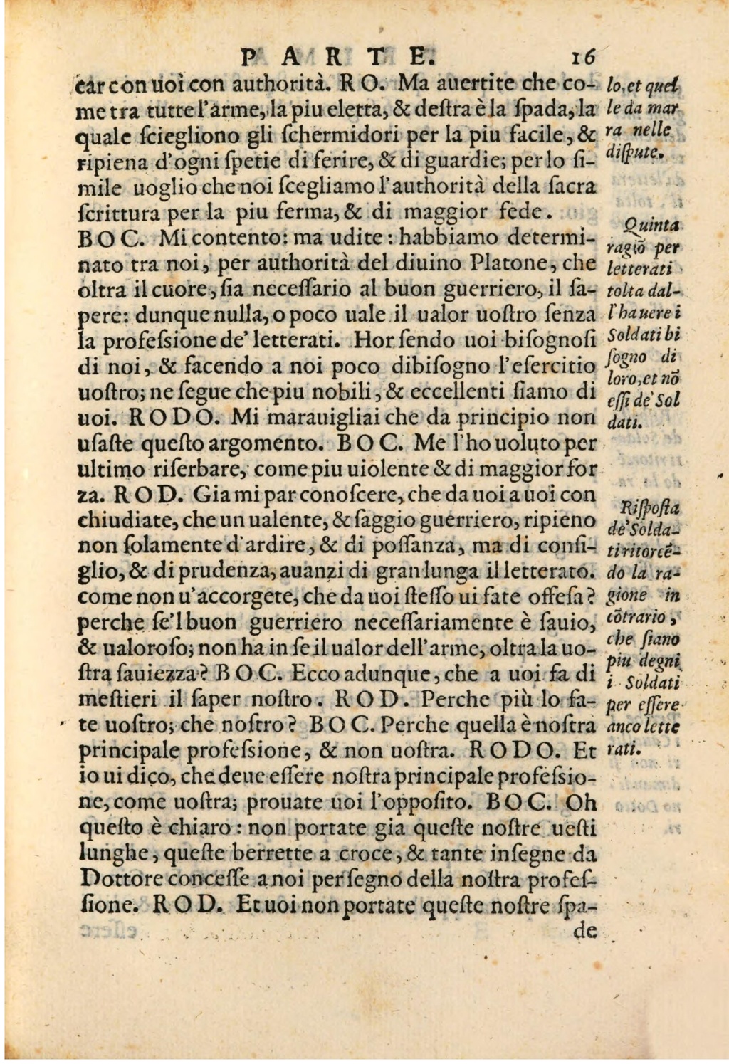 ragio per nato tra noi , per authorità del diuino Platone , che letterati oltra il cuore , fia neceffario al buon guerriero, il fa- tolta dalpere: dunque nulla, o poco uale il ualor uoftro fenza l'hauerei la profefsione de' letterati . Hor fendo uoi bifognofi Soldati bi di noi , & facendo a noi poco dibifogno l'efercitio fogno di loro,et no uoftro; ne ſegue che piu nobili , & eccellenti fiamo di effi de'Sol uoi. RODO. Mi marauigliai che da principio non dati. uſaſte queſto argomento . BOC. Me l'ho uoluto per ultimo riferbare, come piu uiolente & di maggior for za. ROD. Gia mi par conofcere, che da uoi a uoi con Rifpofta chiudiate, che un ualente , & faggio guerriero , ripieno de soldanon folamente d'ardire , & di poffanza , ma di confi- tiritorceglio, & di prudenza, auanzi di gran lunga il letterato. do la racome non u'accorgete, che da uoi fteffo ui fate offefa ? gione in perche fe'l buon guerriero neceffariamente è fauio, cotrario , che fiano & ualorofo; non ha in fe il ualor dell'arme, oltra la uopiu degni ftra fauiezza ? BOC. Ecco adunque , che a uoi fa di i Soldati meftieri il faper noftro . ROD . Perche più lo fa- per effere te uoftro; che noftro ? BOC. Perche quella è noftra anco lette principale profeſsione , & non uoftra. RODO . Et rati. io ui dico, che deue effere noftra principale profefsione, come uoftra; prouate uoi l'oppofito. BOC. Oh queſto è chiaro : non portate gia quefte noftre uefti lunghe , quefte berrette a croce , & tante infegne da Dottore conceffe a noi per fegno della noſtra profef-
