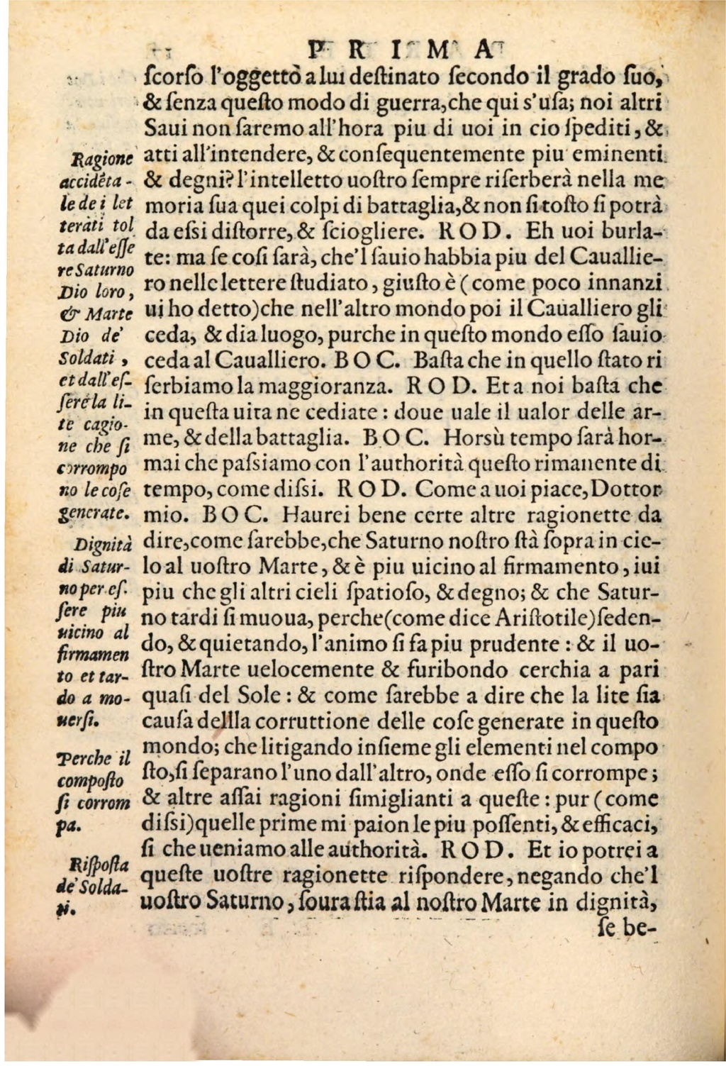 PRIMA fcorfo l'oggetto a lui deftinato fecondo il grado fuo, & fenza quefto modo di guerra, che qui s'ufa; noi altri Saui non faremo all'hora piu di uoi in cio fpediti , & Ragione atti all'intendere, & confequentemente piu eminenti accidéta & degni? l'intelletto uoftro fempre riferberà nella me le de ilet moria fua quei colpi di battaglia, & non fi tofto fi potrà terati tol da efsi diftorre, & fciogliere. ROD . Eh uoi burlata dall'effe te: ma ſe coſi ſarà, che'l fauio habbia piu del Caualliere Saturno Dio loro , ronelle lettere ftudiato , giufto è ( come poco innanzi Marte ui ho detto)che nell'altro mondo poi il Caualliero gli Dio de'