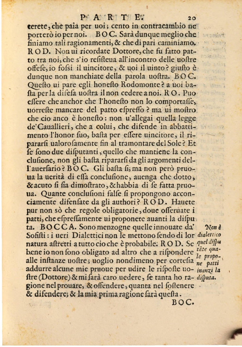 finiamo tali ragionamenti, & che di pari caminiamo. ROD. Non ui ricordate Dottore, che fu fatto patto tra noi, che s'io refifteua all'incontro delle uoftre offefe, io fofsi il uincitore , & uoi il uinto ? giufto è dunque non manchiate della parola uoftra. BOC. Quefto ui pare egli honefto Rodomonte ? a uoi bafta per la difefa uoftra il non cedere a noi. RO . Puo effere che anchor che l'honefto non lo comportaffe, uorrefte mancare del patto eſpreſſo ? ma ui moftro che cio anco è honefto : non u'allegai quella legge de'Cauallieri , che a colui , che difende in abbattimento l'honor fuo, bafta per effere uincitore , il ripararfi ualorofamente fin al tramontare del Sole ? Et fe fono due difputanti , quello che mantiene la conclufione, non gli baſta ripararſi da gli argomenti dell'auerfario ? BOC . Gli baſta ſi; ma non però pruoua la uerità di effa conclufione , auenga che dotto , &acuto fi fia dimoſtrato , & habbia di fe fatta pruoua. Quante conclufioni falſe fi propongono acconciamente difenfate da gli authori ? ROD . Hauete pur non sò che regole obligatorie , doue offeruate i patti, che efpreffamente ui proponete auanti la diſpu