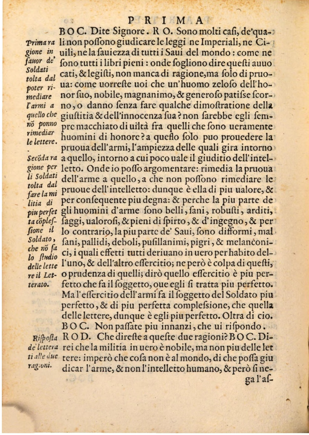 Soldato, che nō fa fani, pallidi, deboli, pufillanimi , pigri , & melanconilo ftudio ci, i quali effetti tutti deriuano in uero per habito deldelle lette l'uno, & dell'altro effercitio; ne però è colpa di quefti, re il Let- oprudenza di quelli; dirò quello effercitio è più perterato. fetto che fa il foggetto, oue egli fi tratta piu perfetto . Ma l'effercitio dell'armi fa il foggetto del Soldato piu. perfetto , & di piu perfetta complefsione, che quella delle lettere, dunque è egli piu perfetto. Oltra di cio . BOC. Non paffate piu innanzi , che ui riſpondo .: Rifpofta ROD.