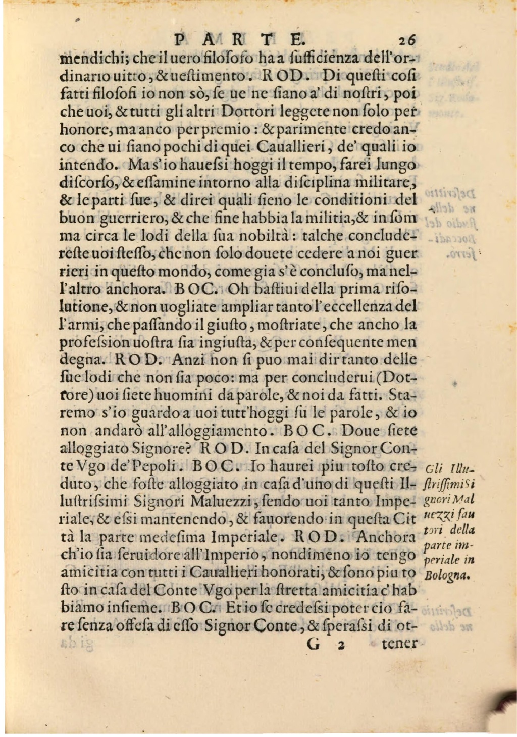 fatti filofofi io non sò, fe ue ne fiano a' di noftri , poi che uoi, & tutti gli altri Dottori leggete non folo per honore, ma anco perpremio : &parimente credo anco che ui fiano pochi di quei Cauallieri , de' quali io intendo. Mas'io hauefsi hoggi il tempo, farei lungo. difcorfo, & effamine intorno alla difciplina militare , & le parti fue , & direi quali fieno le conditioni del buon guerriero, & che fine habbia la militia, & in fom ma circa le lodi della fua nobiltà : talche concluderefte uoi fteffo, che non folo douete cedere a noi guer rieri in queſto mondo, come gia s'è conclufo, ma nell'altro anchora. BOC. Oh baftiui della prima riſolutione, & non uogliate ampliar tanto l'eccellenza del Farmi, che paffando il giufto , moftriate , che ancho la profeſsion uoftra fia ingiufta, & per confequente men degna. ROD. Anzi non fi puo mai dirtanto delle fue lodi che non fia poco: ma per concluderui (Dottore) uoi ſiete huomini da parole, & noi da fatti. Staremo s'io guardo a uoi tutt'hoggi fù le parole , & io non andarò all'alloggiamento . BOC . Doue ficte alloggiato Signore? ROD . In cafa del Signor Conte Vgo de ' Pepoli . BOC .