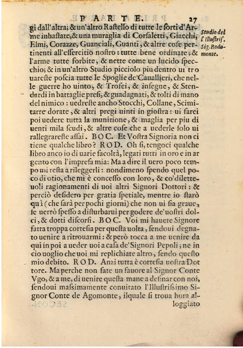 gi dall'altra; & un'altro Raftello di tutte le forti d'Ar- Studio det me inhaftate, & una muraglia di Corfaletti , Giacchi, l'illuftrif. Elmi, Corazze, Guanciali, Guanti , & altre cofe per- sig . Rodotinenti all'effercitio noftro : tutte bene ordinate ; & monte. l'arme tutte forbite , & nette come un lucido fpecchio ; & in un'altro Studio picciolo piu dentro ui tro uarcfte pofcia tutte le Spoglie de Cauallieri, che nelle guerre ho uinto , & Trofei , & infegne , & Stendardi in battaglie prefi, & guadagnati , & tolti di mano del nimico : uedrefte ancho Stocchi, Collane , Scimitarre dorate , & altri prcgi uinti in gioftra : ui farei poi uedere tutta la munitione , & maglia per piu di uenti mila fcudi , & altre cofe che a uederle folo ui rallegrareſte affai . BOC. Et Voftra Signoria non ci tiene qualche libro ? ROD . Oh fi, tengoci qualche libro anco io di uarie facoltà, legati tutti in oro e in ar gento con l'imprefa mia: Ma a dire il uero poco tempo mi refta a rileggerli : nondimeno ſpendo quel poco di otio, che mi è conceffo con loro , & co'diletteuoli ragionamenti di uoi altri Signori Dottori : & perciò defidero per gratia fpetiale, mentre io ftarò ™ quà (che farà per pochi giorni) che non ui fia grauc , fe uerrò fpeffo a difturbarui per godere de'uoftri dolci , & dotti difcorfi . BOC. Voi mi hauete Signore fatta troppa corteſia per qucfta uolta , fendoui degnato uenire a ritrouarmi : & però tocca a me ucnire da qui in poi a ueder uoi a caſa de' Signori Pepoli ; ne in cio uoglio che uoi mi replichiate altro , fendo queſto mio debito. ROD . Anzi tutta è corteſia uoftra Dot tore. Ma perche non fate un fauore al Signor Conte Vgo, & a me, di uenire queſta mane a definar con noi, fendoui mafsimamente conuitato l'Illuftrifsimo Signor Conte de Agomonte , ilquale fi troua hora alloggiato