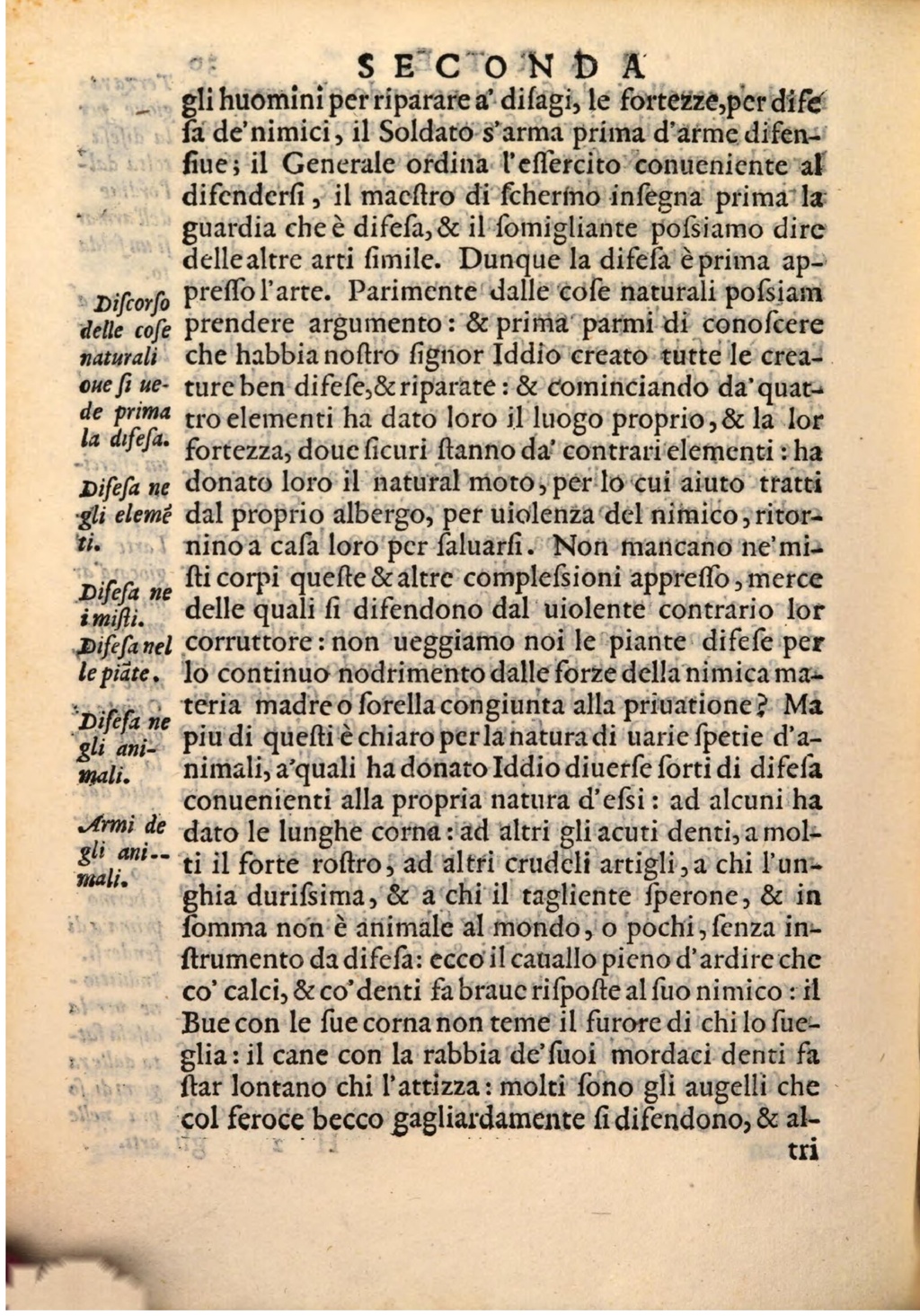 SECONDA gli huomini per riparare a' difagi, le fortezze,per dife fa de'nimici , il Soldato s'arma prima d'arme difenfiue ; il Generale ordina l'effercito conueniente al difenderfi , il maeſtro di fchermo inſegna prima la: guardia che è difefa, & il fomigliante pofsiamo dire delle altre arti fimile. Dunque la difefa è prima ap・ Difcorfo preffo l'arte . Parimente dalle cofe naturali pofsiam delle cofe prendere argumento : & prima parmi di conofcere naturali