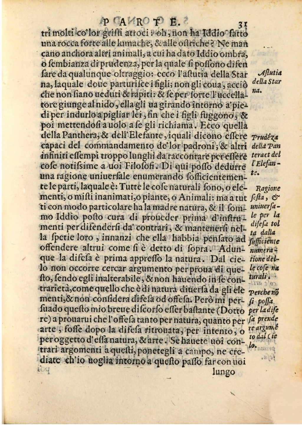 na, laquale doue parturifce i figli; non gli coua , acciò della Star na. che non fiano ueduti & rapiti : & fe per forte l'uccellatorc giunge al nido , ella gli ua girando intorno a'piedi per indurlo a pigliar lei , fin che i figli fuggono , & poi mettendofi a uolo a fe gli richiama . Ecco quella della Panthera, & dell'Elefante , iquali dicono effere Pruděza capaci del commandamento de'lor padroni ; & altri della Pan infiniti effempi troppo lunghi da raccontare per effere teract del cofe notifsime a uoi Filofofi . Di qui poffo dedurre