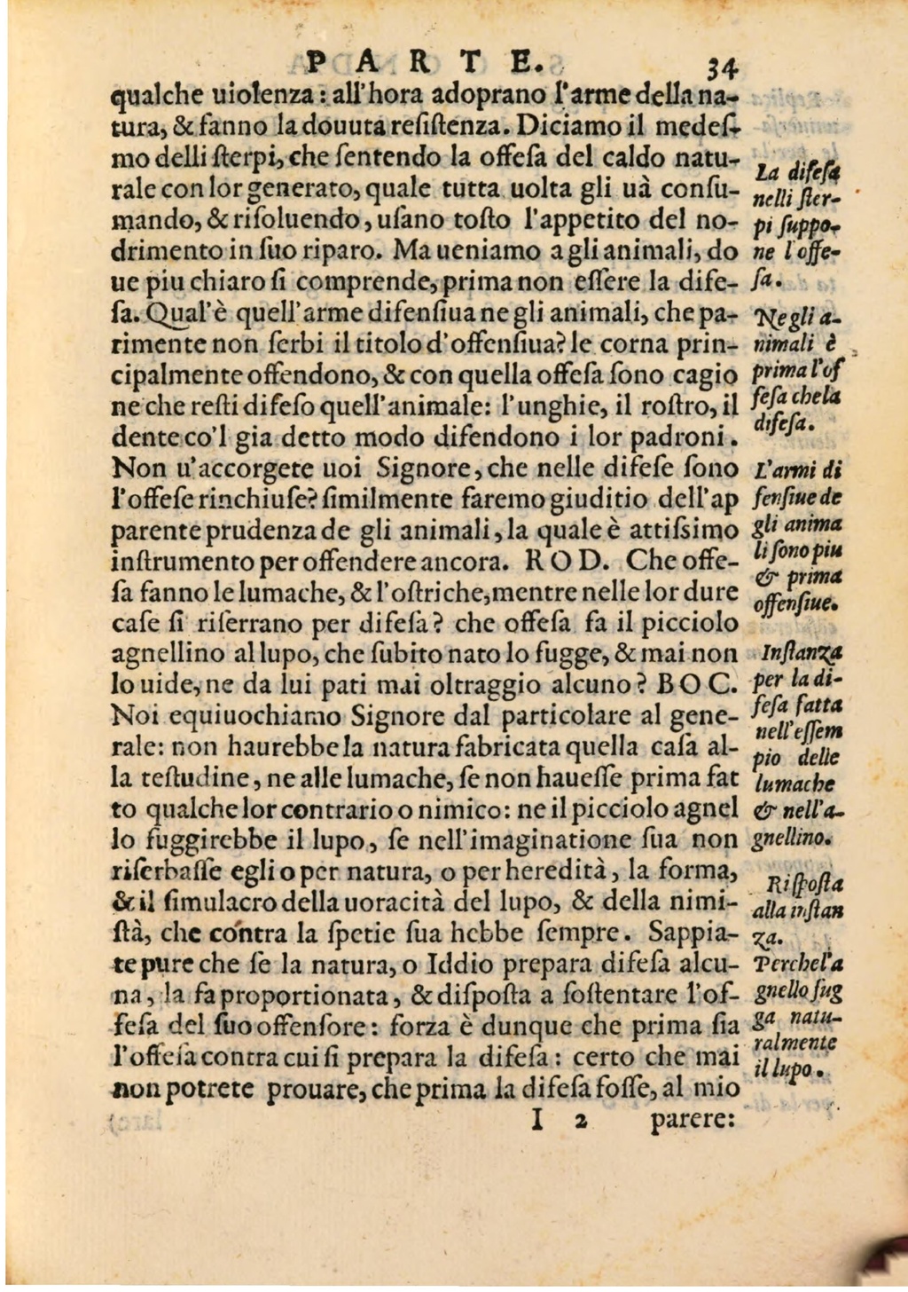 qualche uiolenza : all'hora adoprano l'arme della natura, & fanno la douuta refiftenza . Diciamo il medefmodelli fterpi, che fentendo la offefa del caldo natuLa difefa rale con lor generato, quale tutta uolta gli uà confu- nelli fler mando, & rifoluendo , ufano tofto l'appetito del no- pi fuppodrimento in fuo riparo. Ma ueniamo agli animali, do ne l'offeue piu chiaro fi comprende, prima non effere la dife- fa. La . Qual'è quell'arme difenfiua ne gli animali, che pa- Negli a rimente non ferbi il titolo d'offenfiua? le corna prin- nimali è cipalmente offendono, & con quella offefa fono cagio prima l'of ne che refti difefo quell'animale: l'unghie, il roftro, il fefa chela difefa. dente co'l gia detto modo difendono i lor padroni . Non u'accorgete uoi Signore , che nelle difefe fono L'armi di l'offefe rinchiuſe? fimilmente faremo giuditio dell'ap fenfiue de parente prudenza de gli animali , la quale è attifsimo gli anima inftrumento per offendere ancora. ROD . Che offe- lifonopiu & prima fa fanno le lumache, & l'oftriche,mentre nelle lor dure offenfiue caſe ſi riſerrano per difefa ? che offefa fa il picciolo agnellino al lupo, che fubito nato lo fugge, & mai non