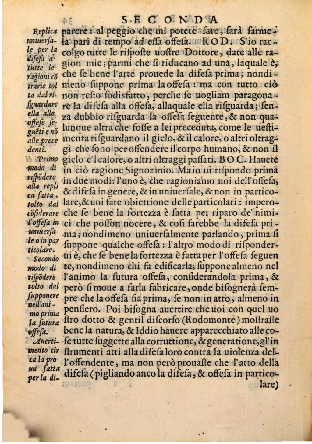 Replica parere : al peggio che mi potete fare , farà farme ROD . S'io racuniuerfa- la pari di tempo ad effa offefa. le per la colgo tutte le rifpofte uoftre Dottore , date alle raLifefa a tutte le gion mic ; parmi che fi riducano ad una , laquale è, ragioni co che fe bene l'arte prouede la difefa prima ; nonditravie tol meno fuppone prima la offefa : ma con tutto ciò ta dalri non refto fodisfatto , perche fe uogliam paragonafguardare re la difefa alla offefa, allaquale ella rifguarda ; fen ella alle za dubbio rifguarda la offefa feguente , & non quaoffefe fe gueti e no lunque altra che foffe a lei preceduta, come le ueſtialle prece menta rifguardano il gielo, & il calore, o altri oltrag denti. gi che fono per offendere il corpo humano, & non il Primo giclo c'l calore, o altri oltraggi paffati. BOC . Hauete modo di in ciò ragione Signor mio . Ma io ui rifpondo prima fpödere in due modi : l'uno è, che ragioniamo noi dell'offefa, alla repli ca fatta , & difefa in genere, & in uniuerfale, & non in particotolto dal lare, & uoi fate obiettione delle particolari : imperocofiderare che fe bene la fortezza è fattá per riparo de' nimitoffefa in ci che poffon nocere , & cofi farebbe la difefa pri uniuerfa- ma ; nondimeno uniuerfalmente parlando , prima fi leo inpar fuppone qualche offefa : l'altro modo di riſponderticolare. Secondo ui è, che fe bene la fortezza è fatta per l'offefa feguen modo di te, nondimeno chi fa edificarla; fuppone almeno nel rifpödere