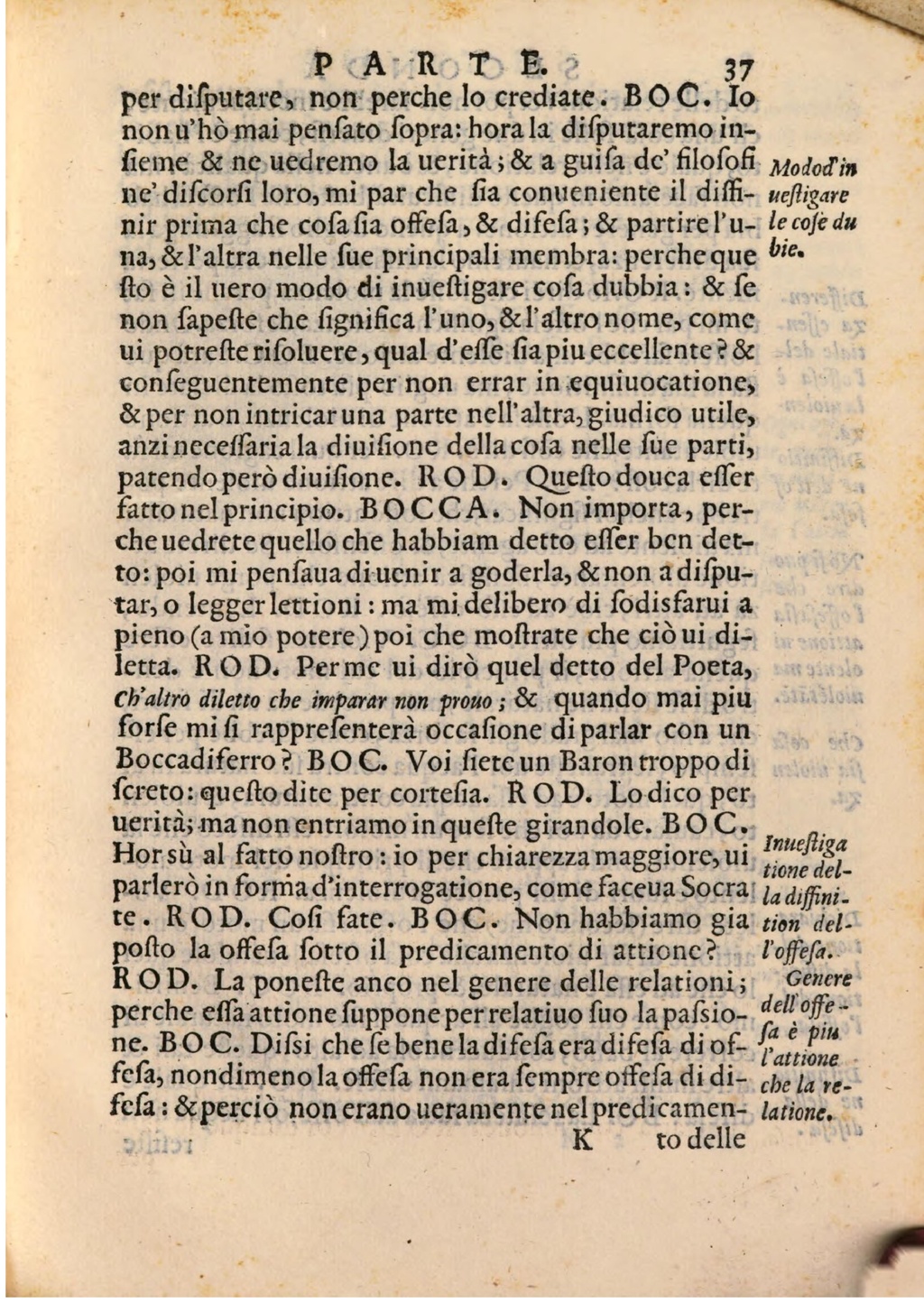 fatto nel principio. BOCCA . Non importa , perche uedrete quello che habbiam detto effer ben detto: poi mi penfaua di ucnir a goderla, & non a difputar, o legger lettioni : ma mi delibero di fodisfarui a pieno (a mio potere ) poi che moftrate che ciò ui diletta. ROD. Per me ui dirò quel detto del Poeta, Ch'altro diletto che imparar non prouo ; & quando mai piu forfe mifi rapprefenterà occafione di parlar con un Boccadiferro ? BOC. Voi fiete un Baron troppo di fcreto: quefto dite per cortefia. ROD. Lo dico per uerità; ma non entriamo in quefte girandole. BOC . Horsù al fatto noftro : io per chiarezza maggiore, ui parlerò in forma d'interrogatione, come faceua Socra te . ROD. Cofi fate . BOC . Non habbiamo gia pofto la offefa fotto il predicamento di attione ? ROD. La ponefte anco nel genere delle relationi ;