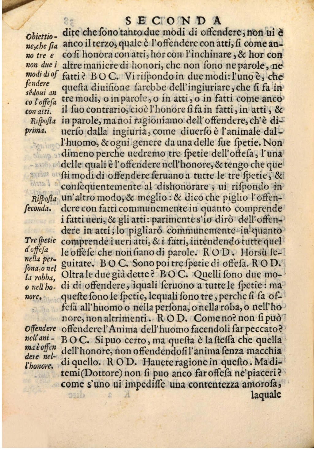 SECOND´A Obiettio- dite che fono tanto due modi di offendere , non ui è ne,chefia anco il terzo, quale è l'offendere con atti, fi come anno tre e cofi honora con atti , hor con l'inchinare , & hor con non due i altre manicre di honori, che non fono ne parole , ne modi diof fatti ? BOC. Virifpondo in due modi : l'uno è , che fendere sedoui an quefta diuifione farebbe dell'ingiuriarc , che ſi fa in co l'offefa tre modi, o in parole , o in atti , o in fatti come anco con atti.