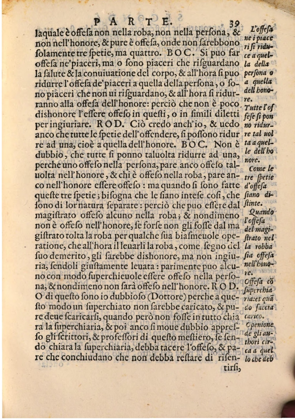 L'offesa laquale è offefa non nella roba, non nella perfona , & non nell'honore, & pure è offefa, onde non farebbono ne ipiace rifi ridu folamente tre fpetie, ma quattro. BOC. Si puo far ce a queloffefa ne'piaceri, ma o fono piaceri che rifguardano la della la falute & la conuiuatione del corpo, & all'hora fi puo perfona o ridurre l'offefa de piaceri a quella della perfona , o fo- a quella no piaceri che non ui rifguardano , & all'hora fi ridur- dell honore. ranno alla offefa dell'honore : perciò che non è poco Tutte l'of dishonore l'effere offefo in quefti , o in fimili diletti fefefi pon per ingiuriare. ROD. Ciò credo anch'io , & ucdo no riduranco che tutte le fpetie dell' offendere, fi poffono ridur re tal uol re ad una, cioè a quella dell'honore. BOC. Non è ta a quel le dell'ho dubbio , che tutte fi ponno taluolta ridurre ad una, percheuno offefo nella perfona, pare anco offefo tal- more. Come le uolta nell'honore , & chi è offefo nella roba , pare an- tre petie co nell'honore effere offefo : ma quando fi fono fatte d'offesa quefte tre fpetie ; bifogna che le fiano intefe cofi , che fiano di fono di lor natura ſeparate : perciò che puo effere dal finte. magiftrato offefo alcuno nella roba ; & nondimeno Quando l'offesa non è offefo nell'honore, fe forfe non gli foffe dal ma del magigiftrato tolta la roba per qualche fua biafmeuole ope- ftrato nel ratione; che all'hora il leuarli la roba , come fegno del la robba fuo demerito , gli farebbe dishonore, ma non ingiu- fia offeſa ria, fendoli giuſtamente leuata : parimente puo alcu- nell'hono.re . no con modo fuperchieuole effere offefo nella perſona, & nondimeno non farà offefo nell'honore. ROD. offefa cõ Superchia O di quefto fono io dubbiofo (Dottore) perche a que- ria:et qua fto modo un fuperchiato non farebbe caricato, & pu- do faccia re deue fcaricarfi, quando però non foffe in tutto chia carico. ra la fuperchiaria, & poi anco fi moue dubbio appref- Openione fo gli fcrittori, & profeffori di quefto meftiero, fe fen- de gli anthori cirdo chiara la fuperchiaria, debba tacere l'offefo, & pa- ca a quel re che conchiudano che non debba reſtare di rifen- lo che deb
