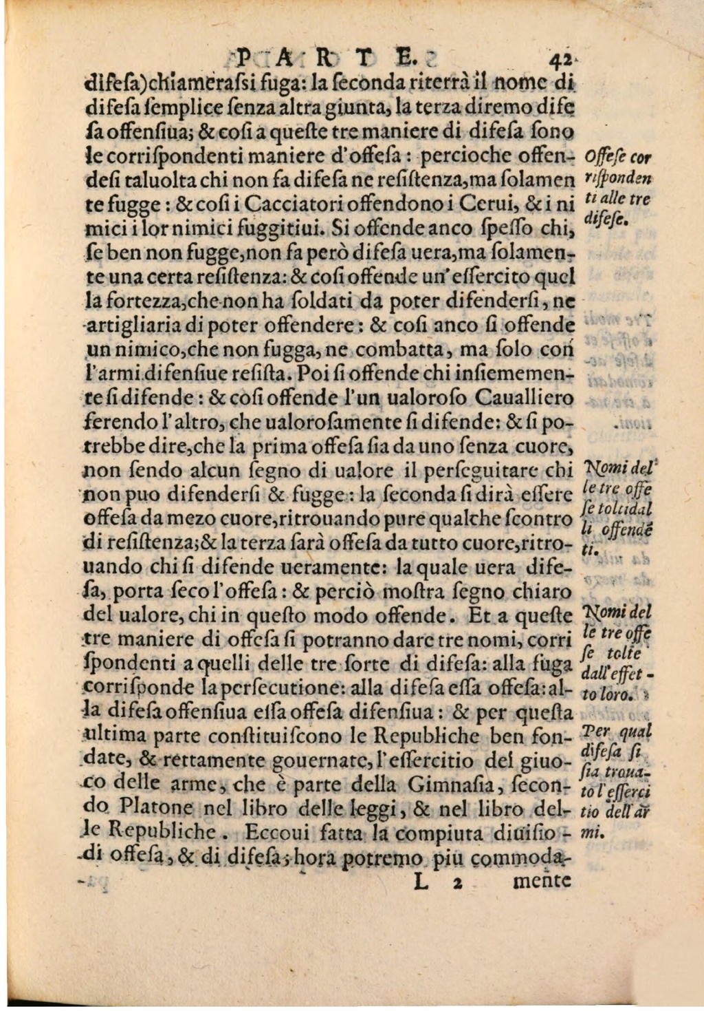 difefa)chiameraſsi fuga: la feconda riterrà il nome di difefa femplice ſenza altra giunta, la terza diremo dife fa offenfiua; & cofi a queſte tre maniere di difefa fono le corrispondenti maniere d'offefa : percioche offen- offefe cor defi taluolta chi non fa difefa ne refiftenza,ma folamen rifponden te fugge : & cofii Cacciatori offendono i Cerui, & ini talle tre difefe. micii lor nimici fuggitiui. Si offende anco fpeffo chi, fe ben non fugge, non fa però difefa uera,ma folamen te una certa reſiſtenza : & cofi offende un'effercito quel la fortezza,che non ha foldati da poter difenderfi , ne artigliaria di poter offendere : & cofi anco fi offende un nimico, che non fugga, ne combatta , ma folo con l'armi difenfiue refifta . Poi fi offende chi infiememente fi difende : & cofi offende l'un ualorofo Caualliero ferendo l'altro, che ualorofamente fi difende: &fi potrebbe dire, che la prima offefa fia da uno ſenza cuore, non fendo alcun fegno di ualore il perfeguitare chi Nomidel' non puo difenderfi & fugge : la feconda fi dirà effere Le tre offe fe toltidal offefa da mezo cuore,ritrouando pure qualche fcontro li offende di refiftenza;& la terza farà offefa da tutto cuore,ritro- ti. uando chi fi difende ueramente : la quale uera difefa, porta feco l'offefa : & perciò moſtra ſegno chiaro del ualore, chi in quefto modo offende . Et a quefte Nomi del tre maniere di offefa fi potranno dare tre nomi, corri le treoffe fe tolte fpondenti a quelli delle tre forte di difefa: alla fuga dall'effetcorrisponde la perfecutione : alla difefa effa offefa: al- toloro. la difefa offenfiua effa offefa difenfiua : & per queſta ultima parte conſtituiſcono le Republiche ben fon- Per qual difefa fi date, & rettamente gouernate, l'effercitio del giuo- fia trouaco delle arme , che è parte della Gimnafia , fecon- to l'efferci do Platone nel libro delle leggi , & nel libro del- tio dell ar le Republiche .